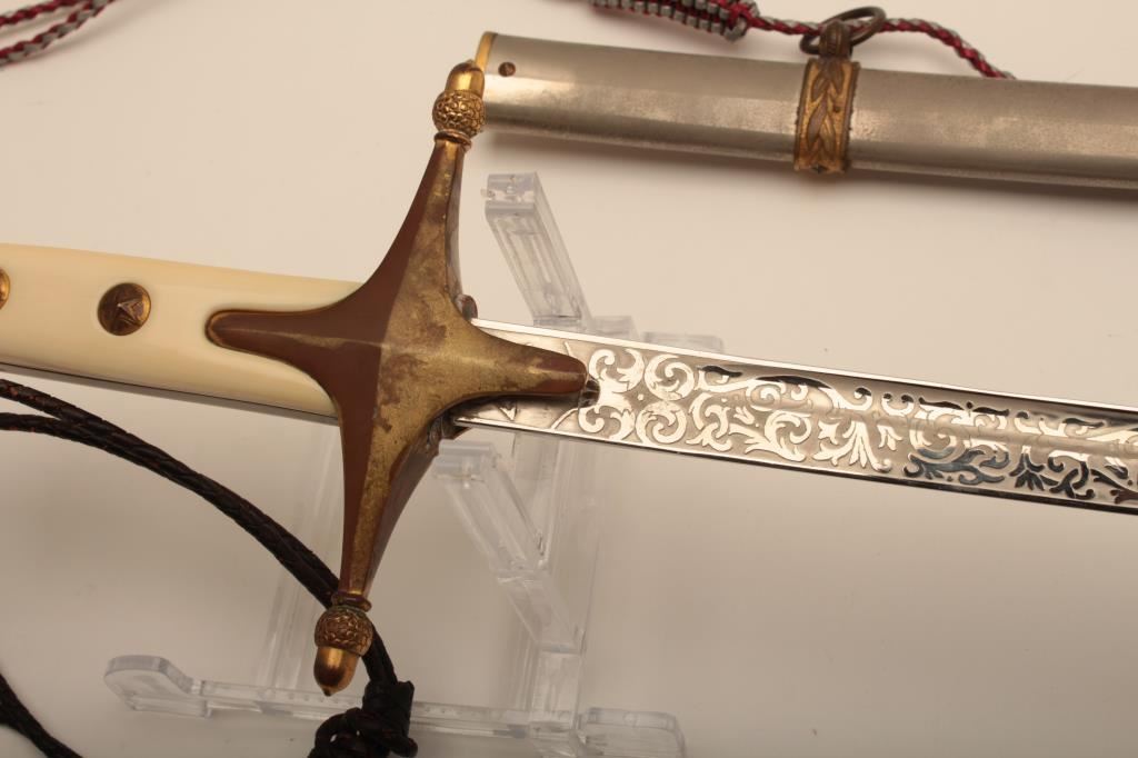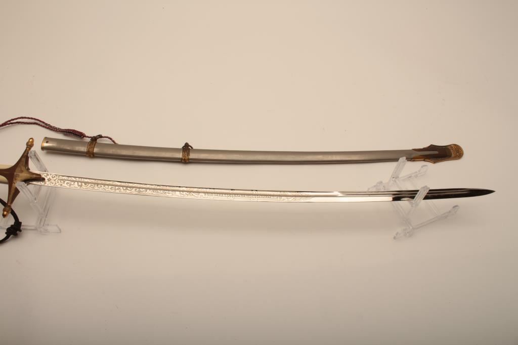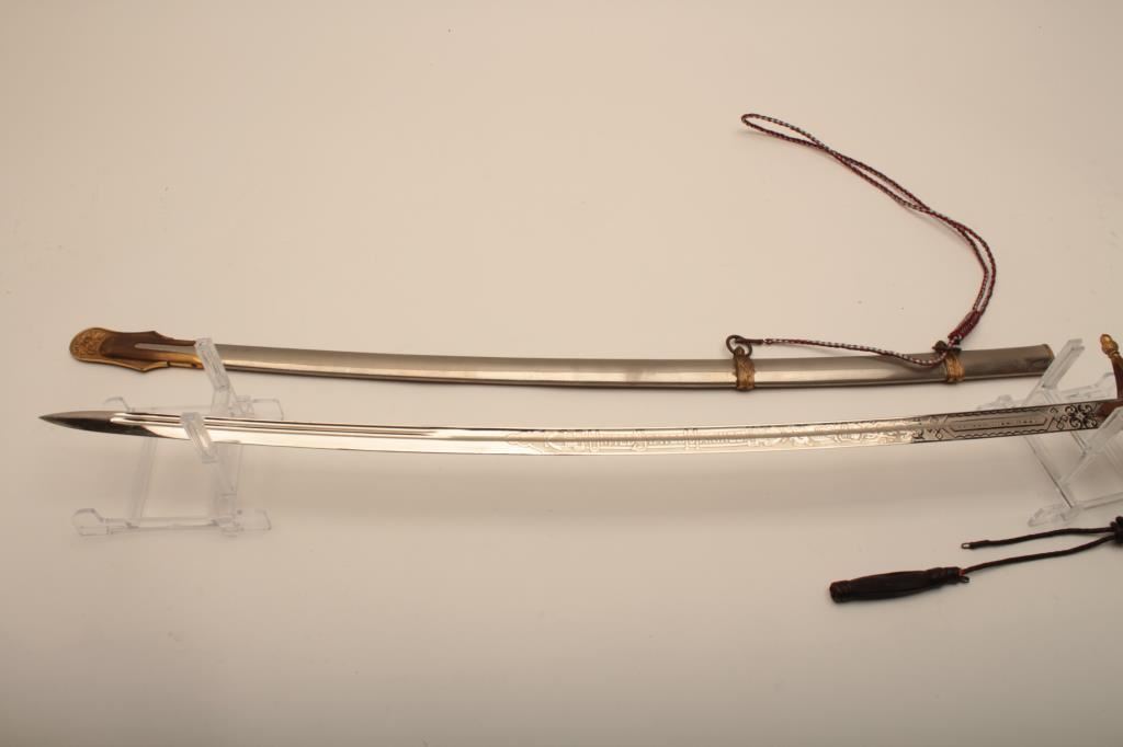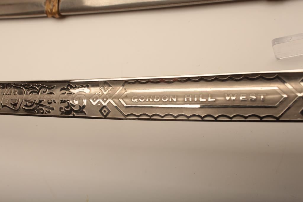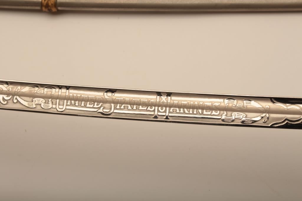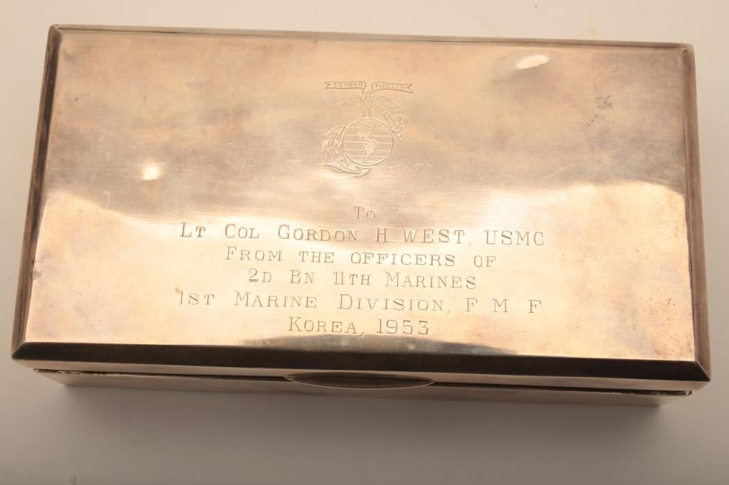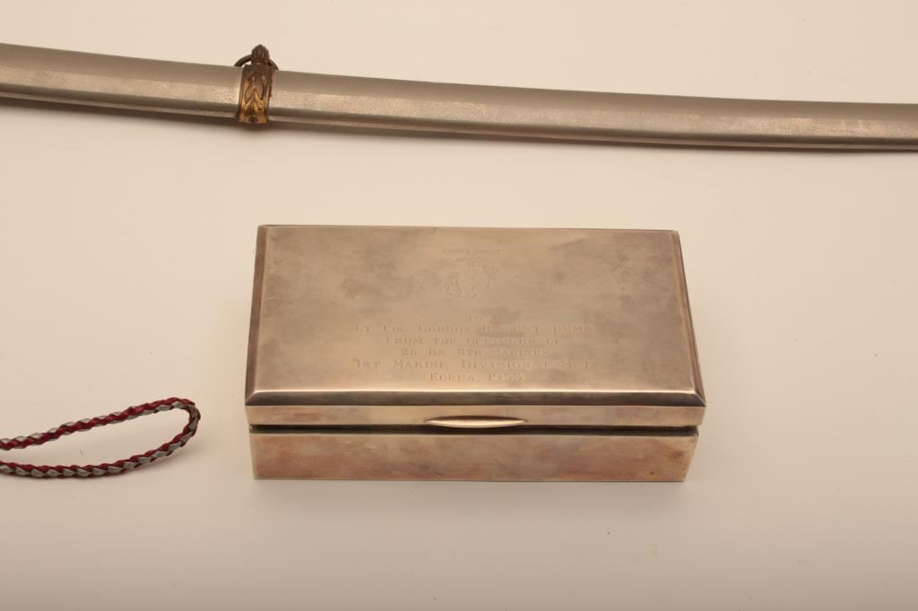 Marine Corps Mamaluke style Officer's sword etched Gordon Hill West. Includes sterling cigarette box engraved with Marine Corps emblem and "Lt. Col. Gordon H. West USMC From the Officers of 2nd Bn 11th Marines, 1st Marine Division, F.M.F., Korea, 1953". Sword near fine with minor oxidation, box hallmarked and signed Tack-Hing, very good plus, smal dents only. Collected many years ago by prominent City of Orange dealer. Est. $500-1000.