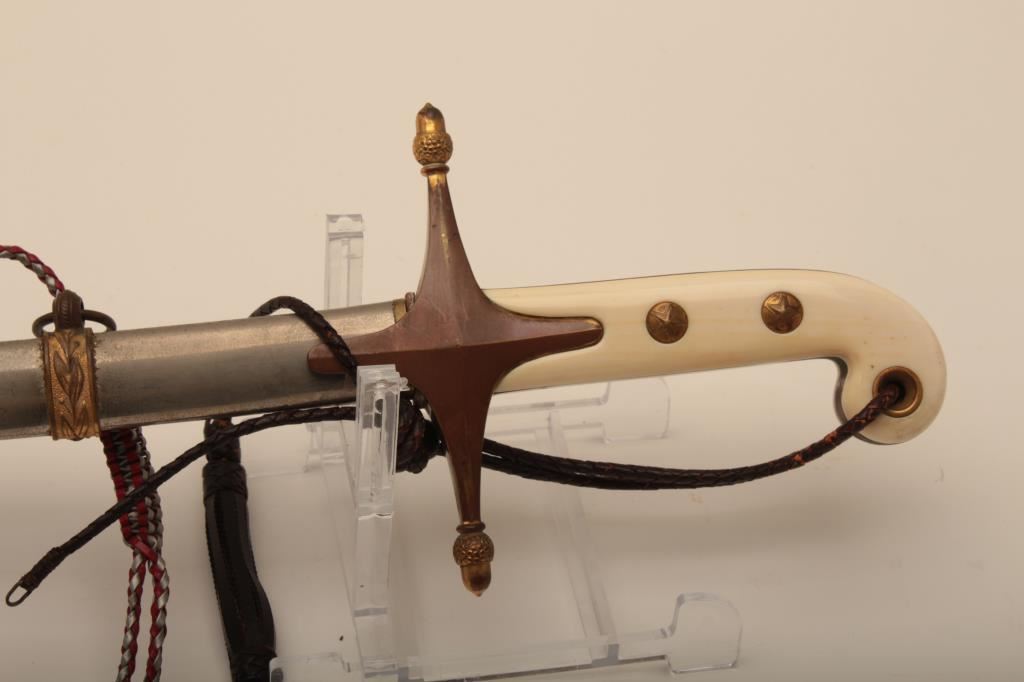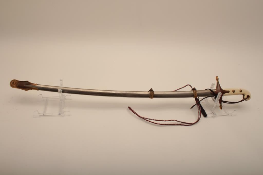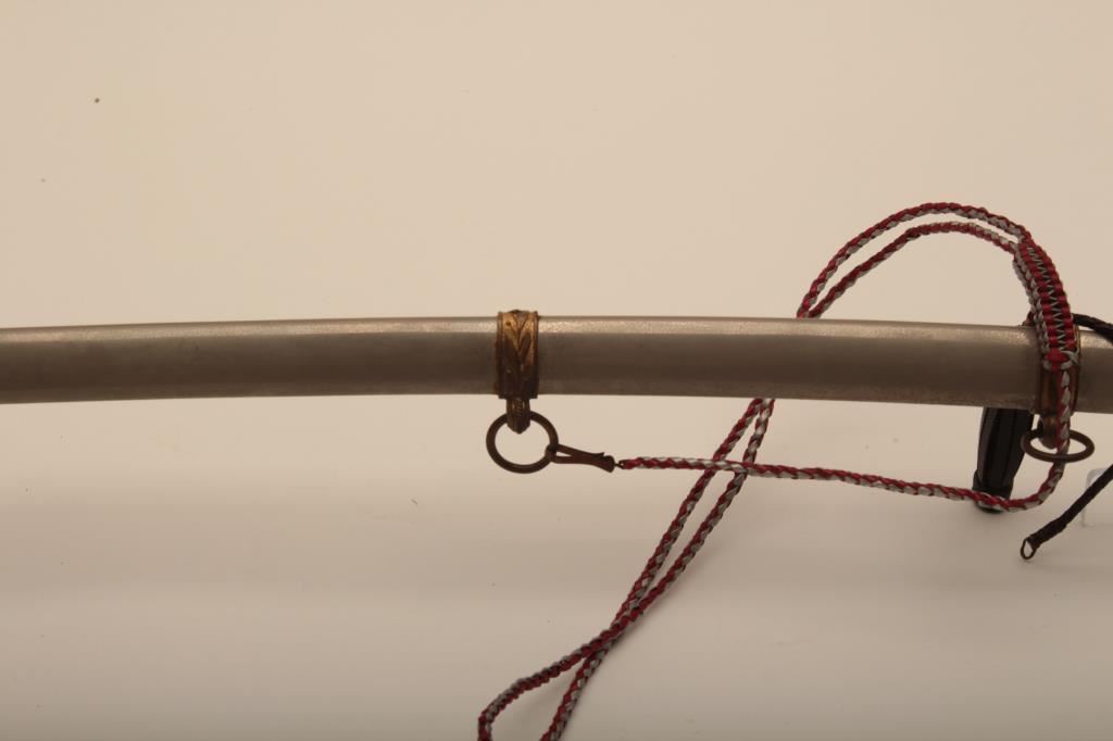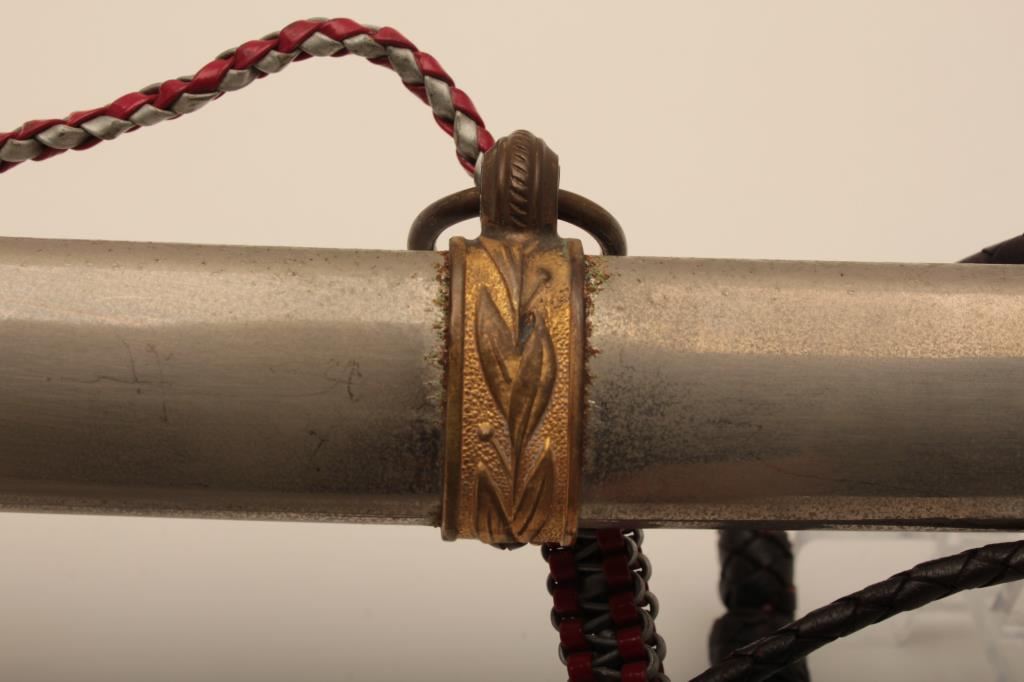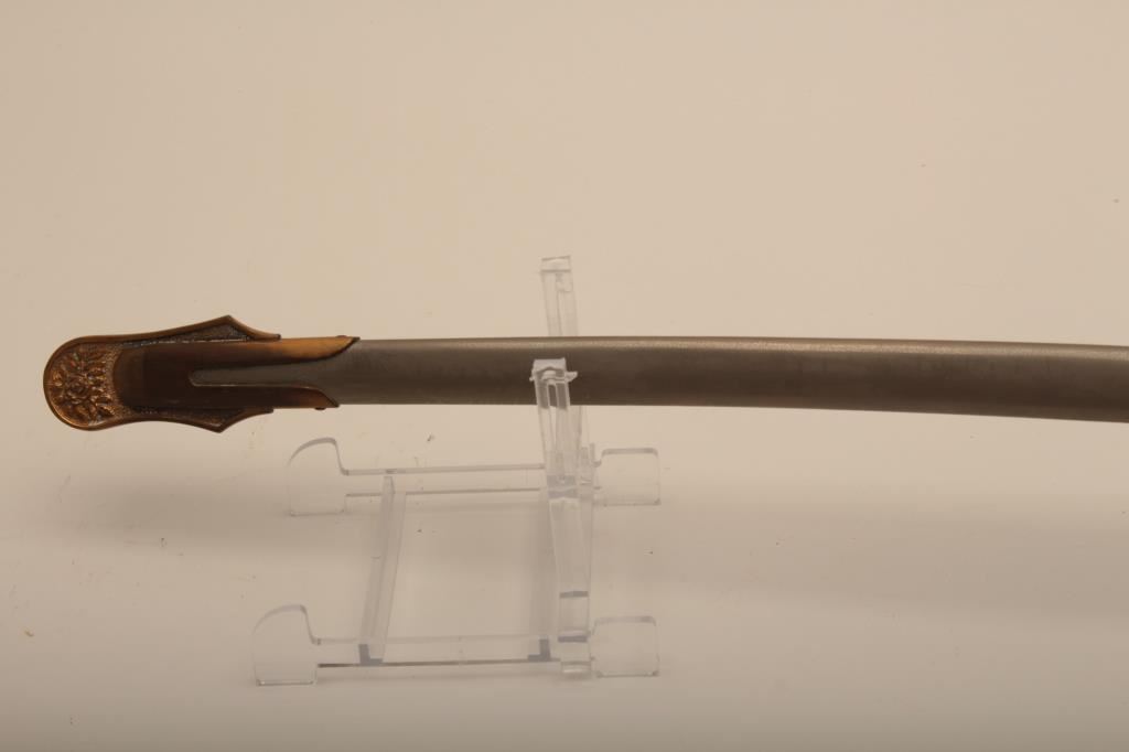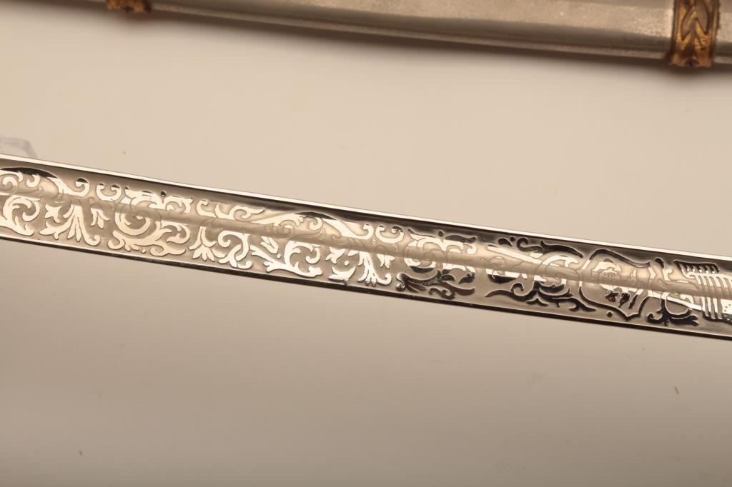 Marine Corps Mamaluke style Officer's sword etched Gordon Hill West. Includes sterling cigarette box engraved with Marine Corps emblem and "Lt. Col. Gordon H. West USMC From the Officers of 2nd Bn 11th Marines, 1st Marine Division, F.M.F., Korea, 1953". Sword near fine with minor oxidation, box hallmarked and signed Tack-Hing, very good plus, smal dents only. Collected many years ago by prominent City of Orange dealer. Est. $500-1000.