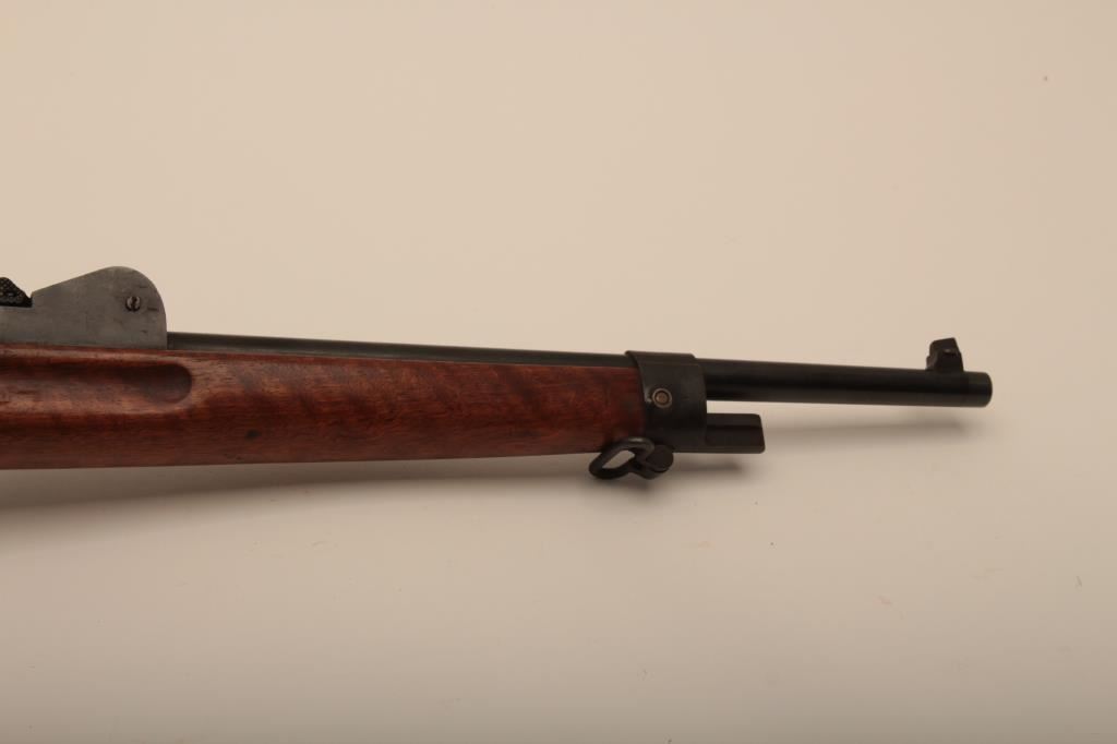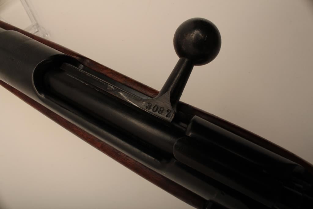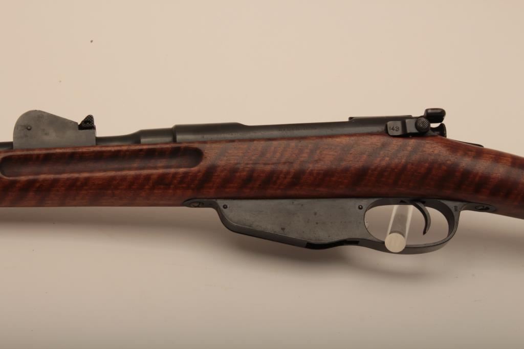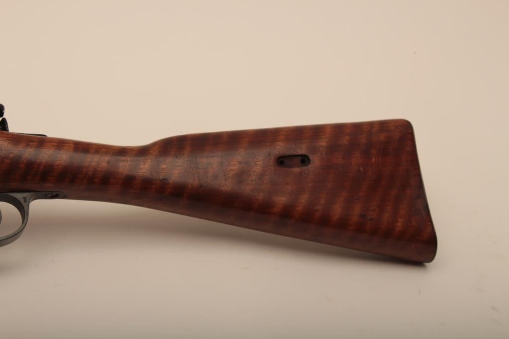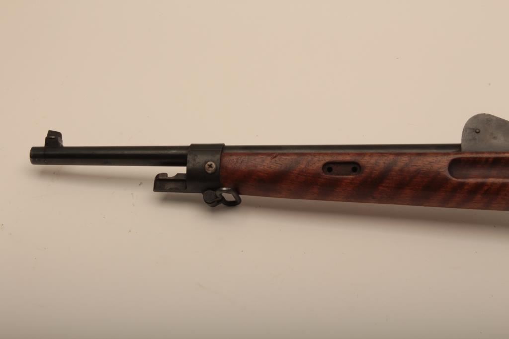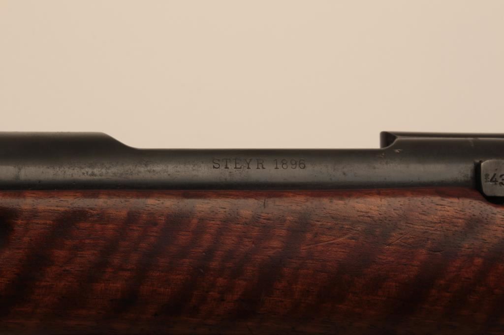 Steyr Model 96 Carbine, 8mm cal., marked 58p on breech and rear of barrel, Exceptional stock with tiger striped grain, swivels removed, 80-90% old reblued arsenal type finish. Bolt mismatched. Bore only fair and dark. (C&R) Est. $150-300