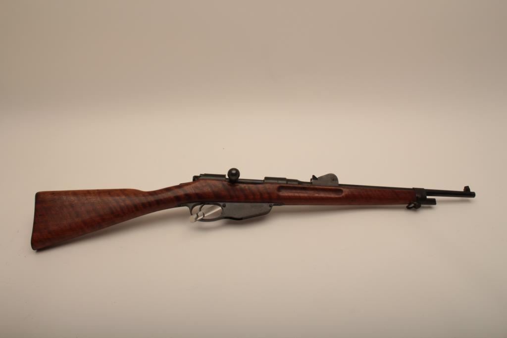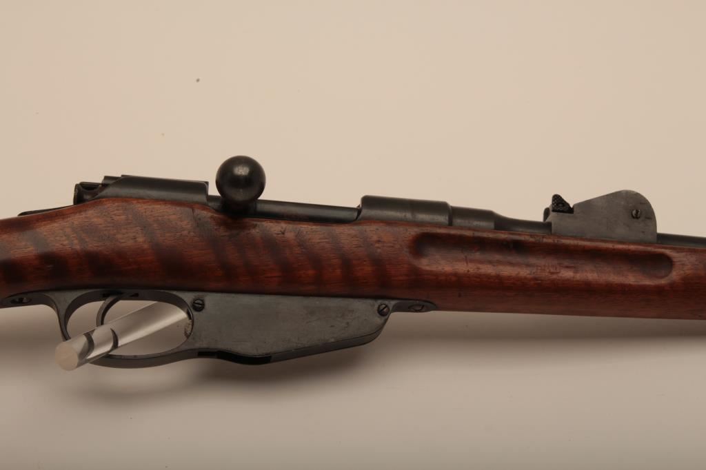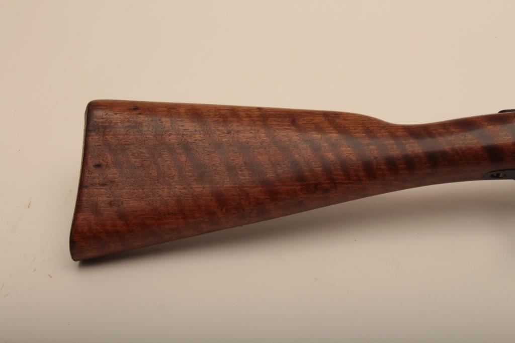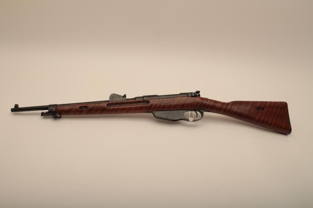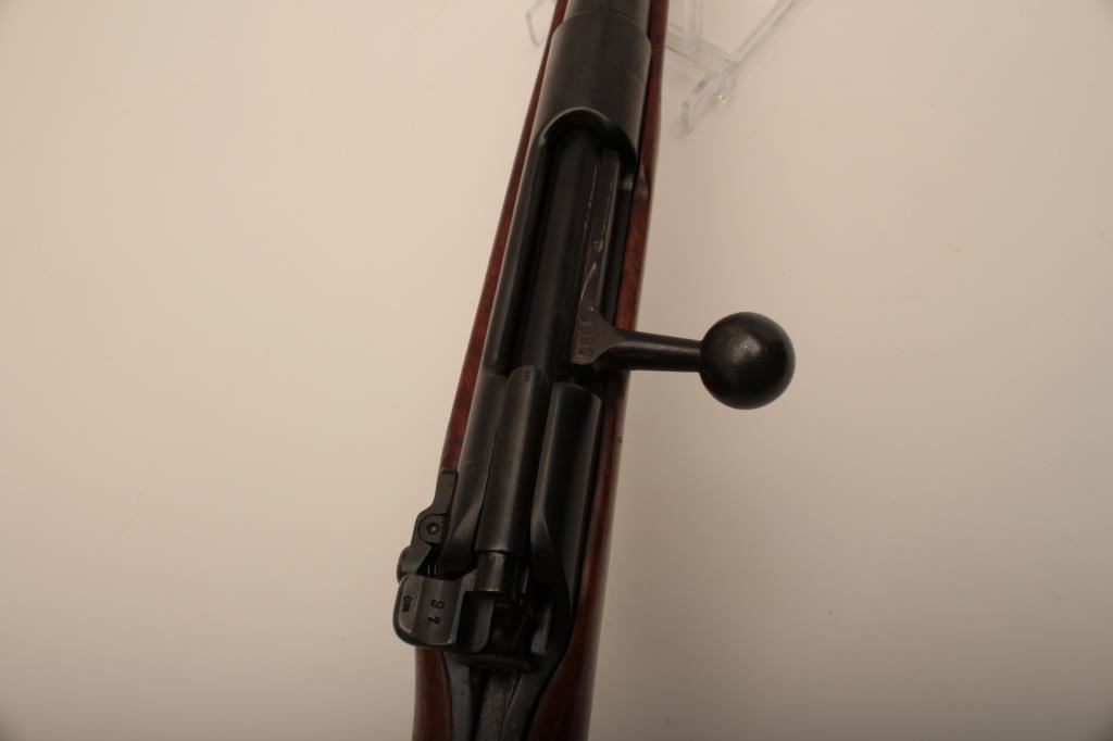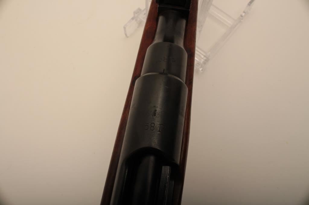 Steyr Model 96 Carbine, 8mm cal., marked 58p on breech and rear of barrel, Exceptional stock with tiger striped grain, swivels removed, 80-90% old reblued arsenal type finish. Bolt mismatched. Bore only fair and dark. (C&R) Est. $150-300