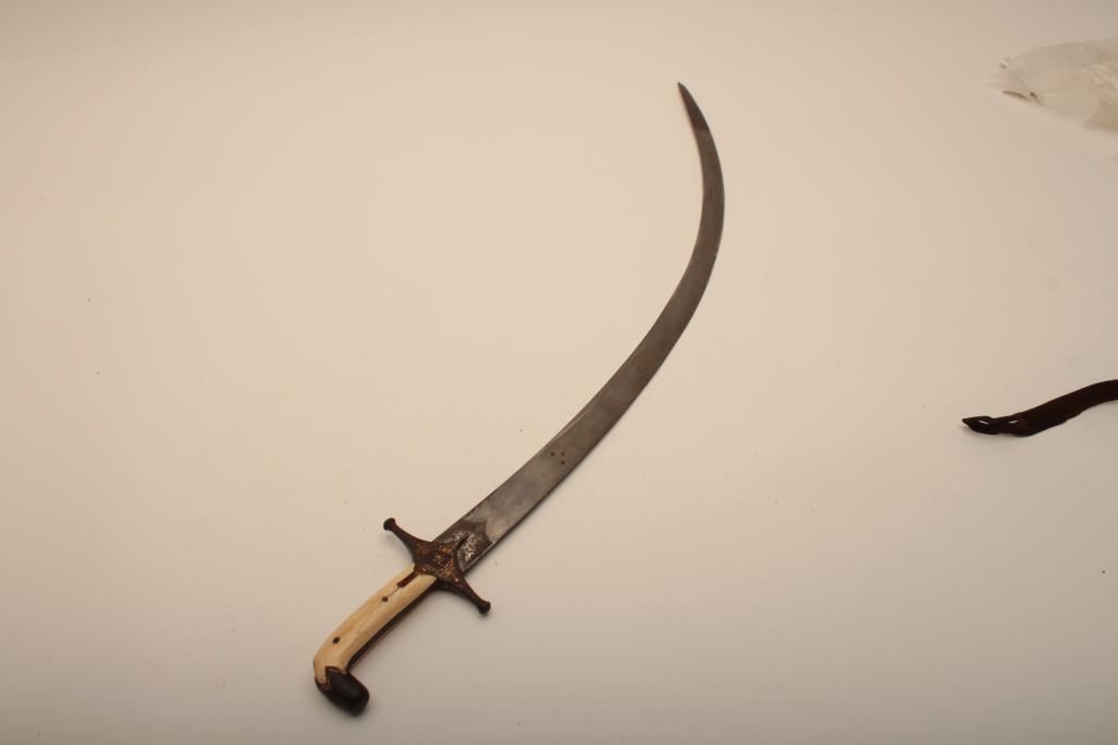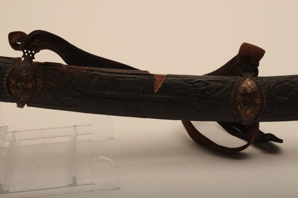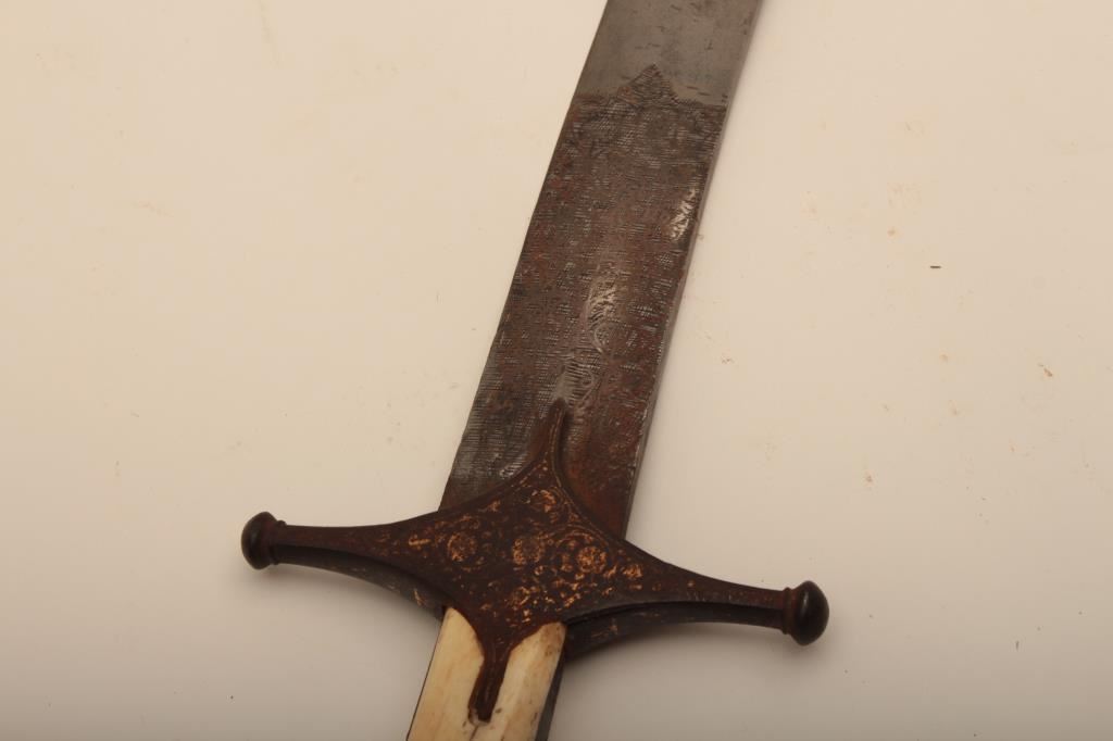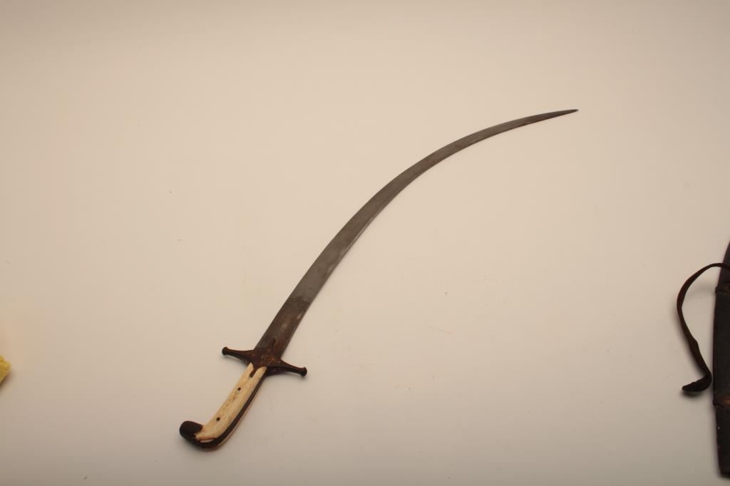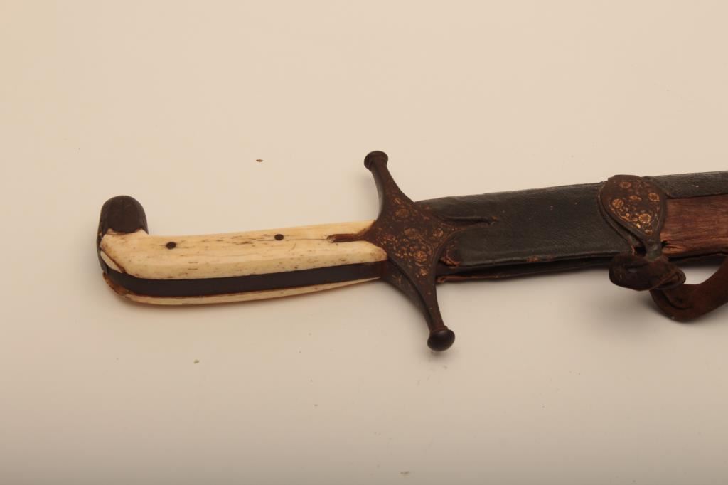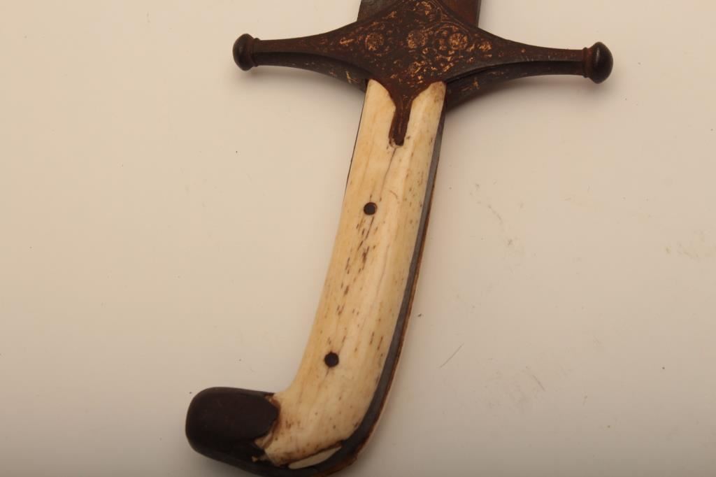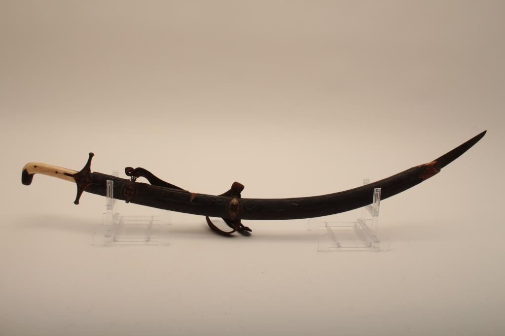 19th Century or earlier Mid Eastern sword with scabbard, bone grip, damascened gold ornamentations on hilt and scabbard. Scabbard missing drag and front end. Reminants of inlay and darkened writing at rear of blade where meets hilt. 31" curved blade, 35 1/2" overall, fair condition overall as found in Circle of Orange antique dealers estate. Est. $500-1000