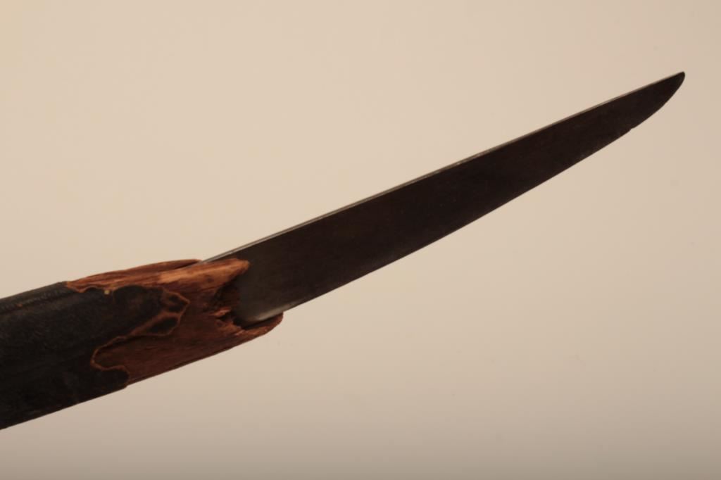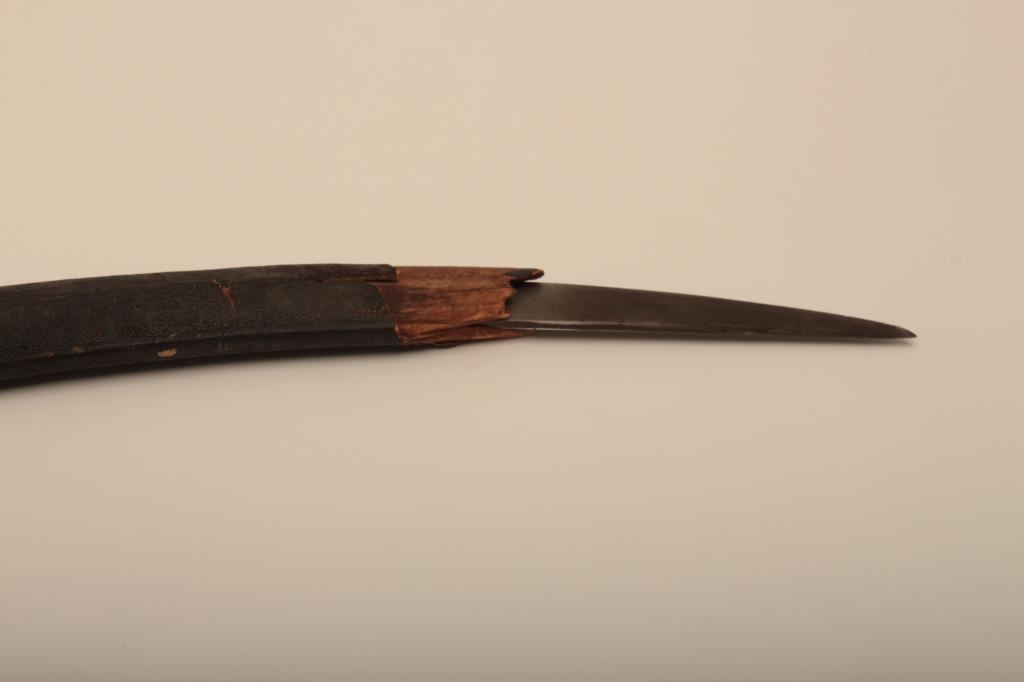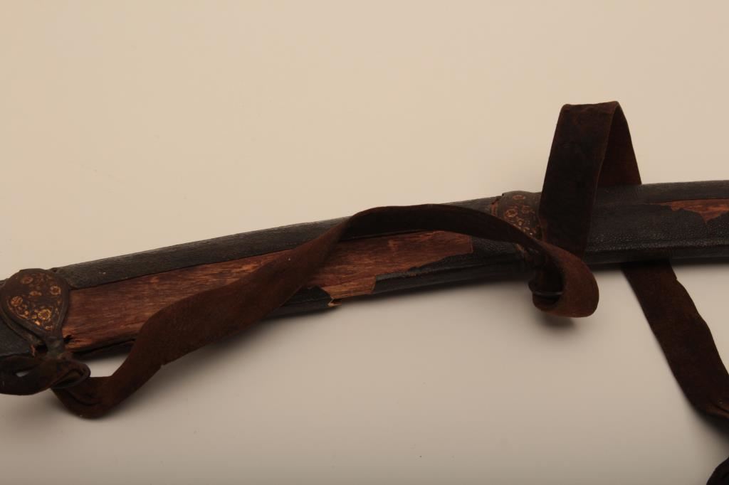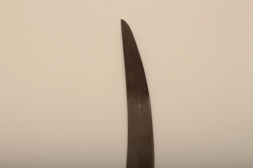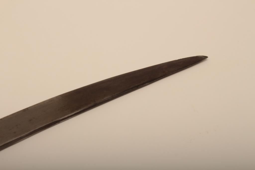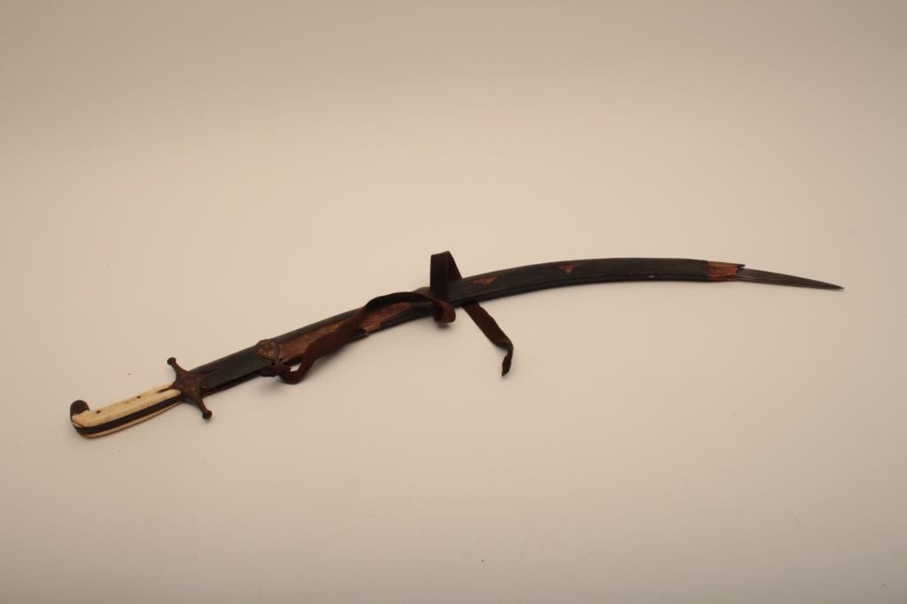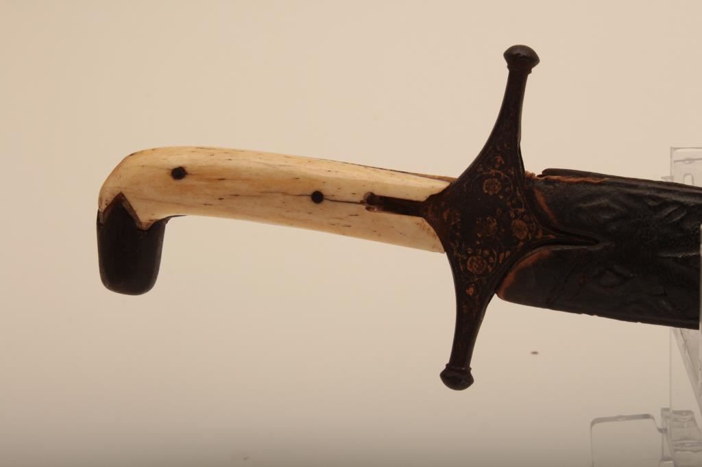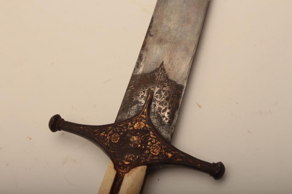 19th Century or earlier Mid Eastern sword with scabbard, bone grip, damascened gold ornamentations on hilt and scabbard. Scabbard missing drag and front end. Reminants of inlay and darkened writing at rear of blade where meets hilt. 31" curved blade, 35 1/2" overall, fair condition overall as found in Circle of Orange antique dealers estate. Est. $500-1000