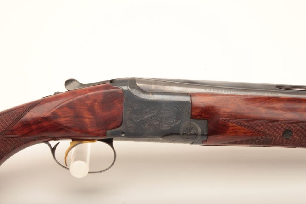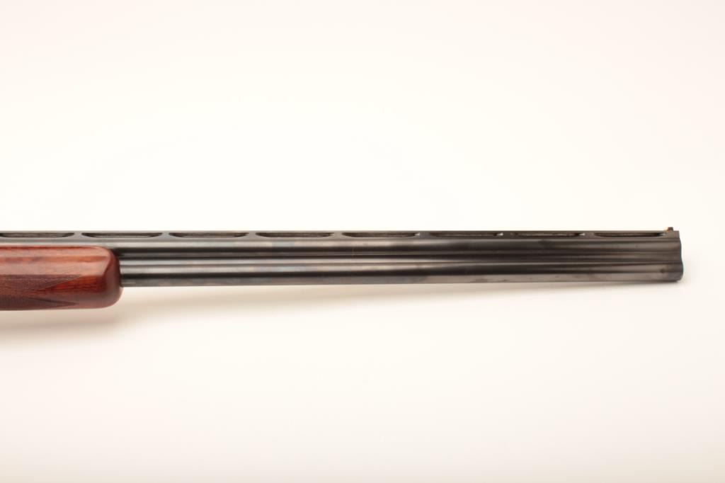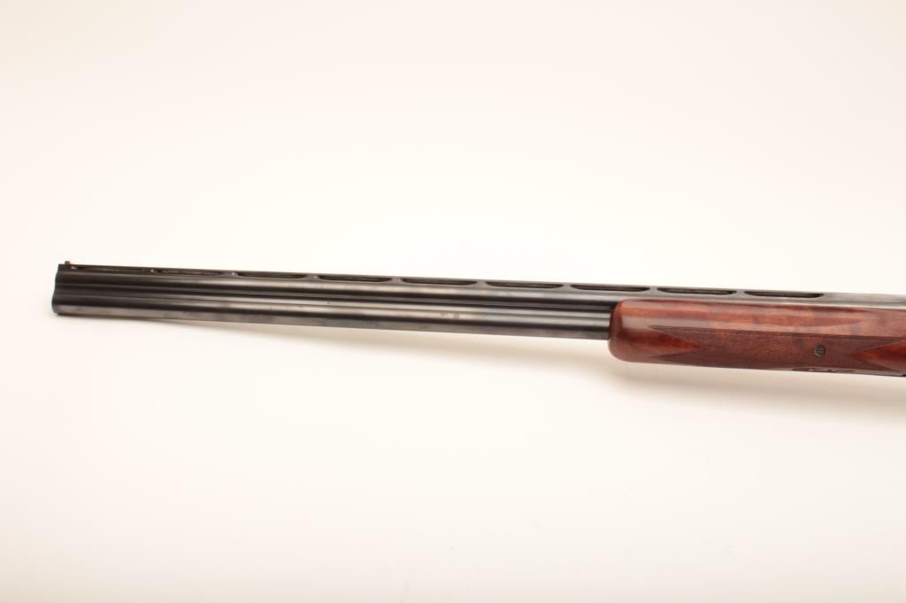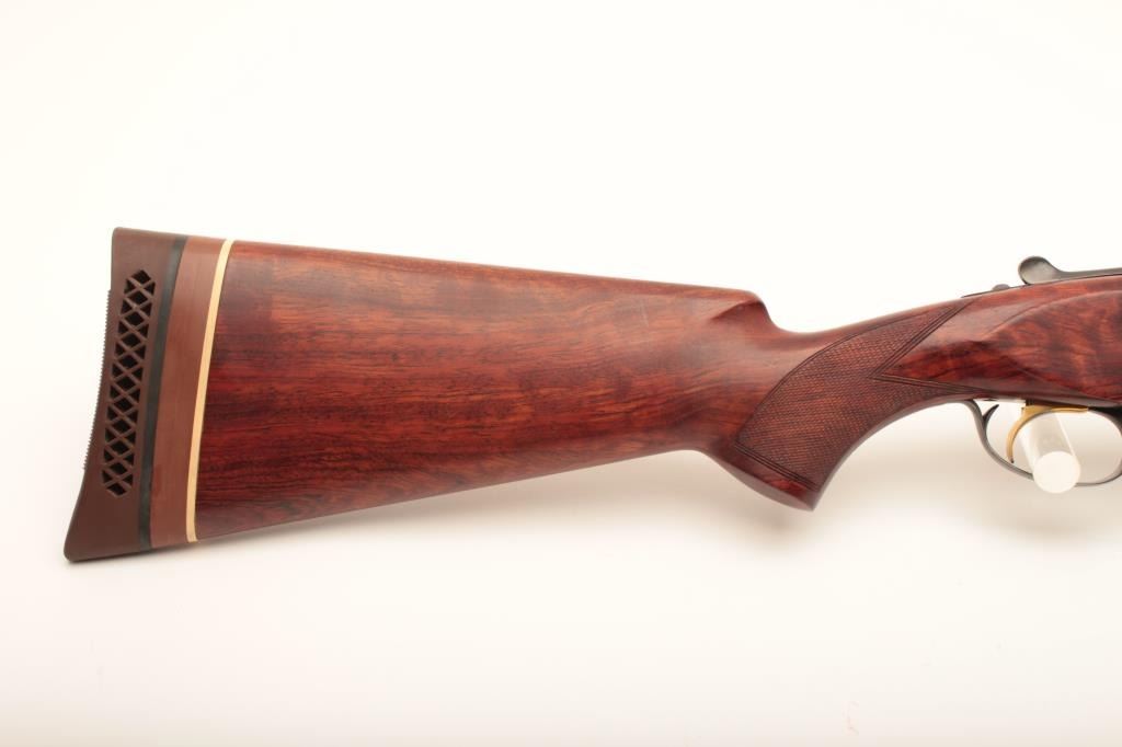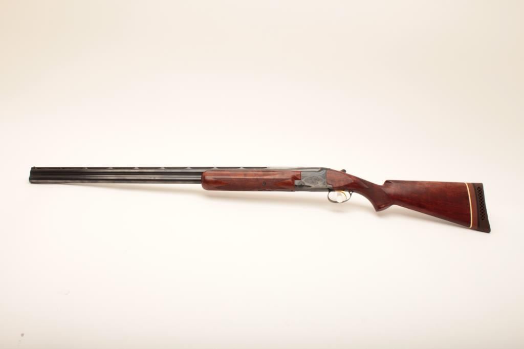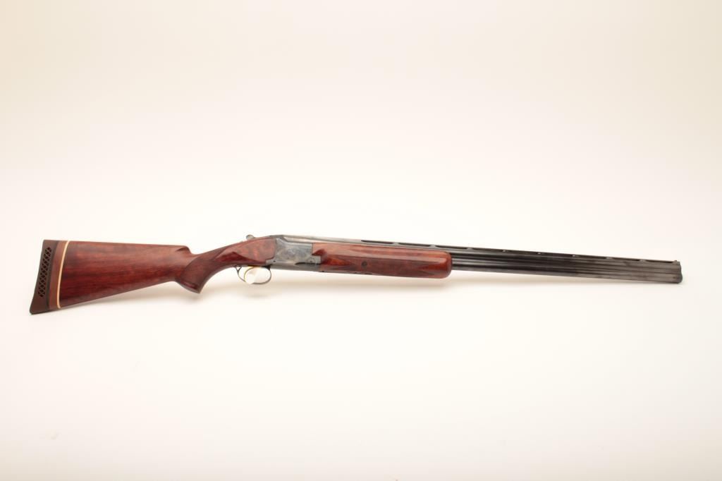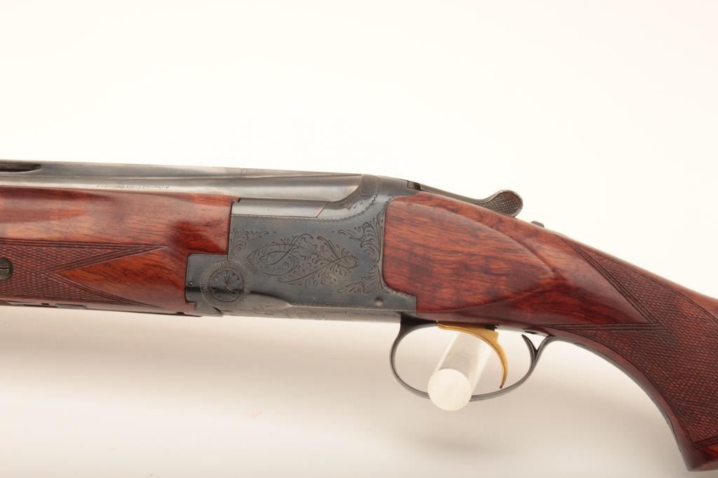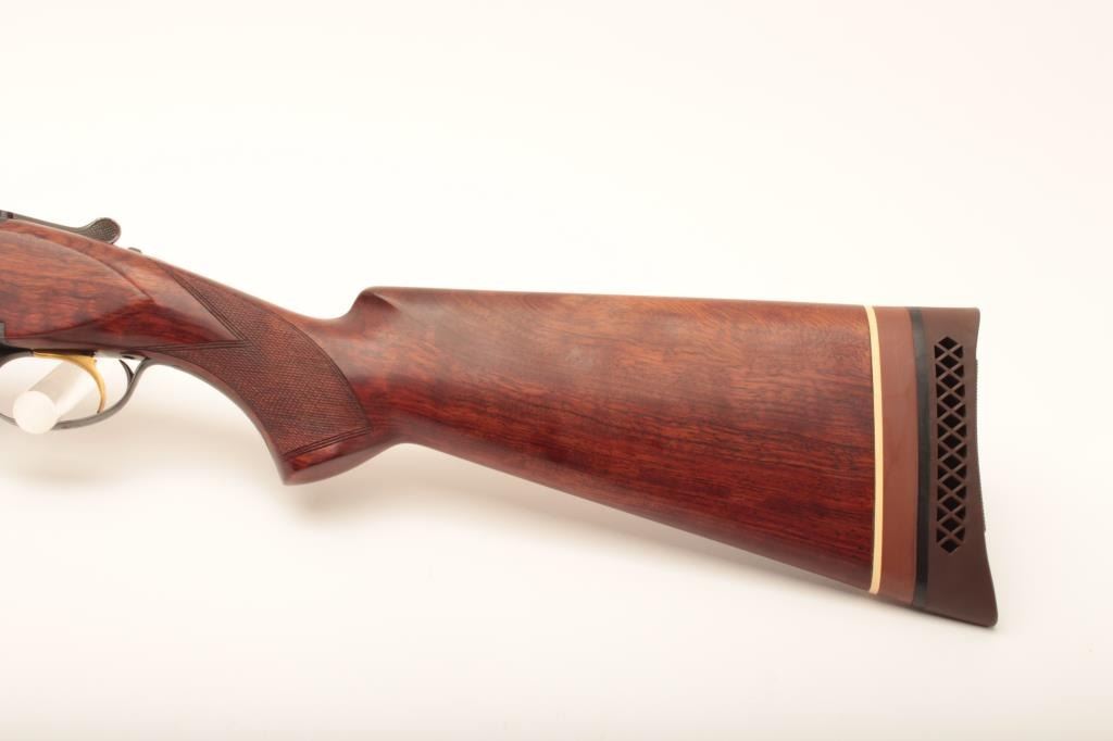 Belgian-made Browning Lightning Superposed shotgun, 12 gauge, 32” barrels with Broadway rib, blued finish, checkered wood stocks with extended butt stock and pad, 15.5” LOP, single trigger, S/N 37402 S5; overall very good to fine condition with fine bores, majority of original finish, crisp action, sharp markings and very good to near fine wood; accompanied by a padded hard carry case. (Modern). Est.: $350-$700.