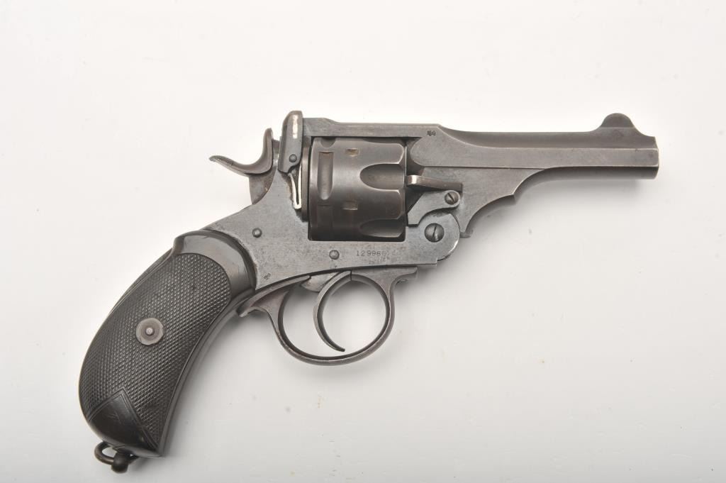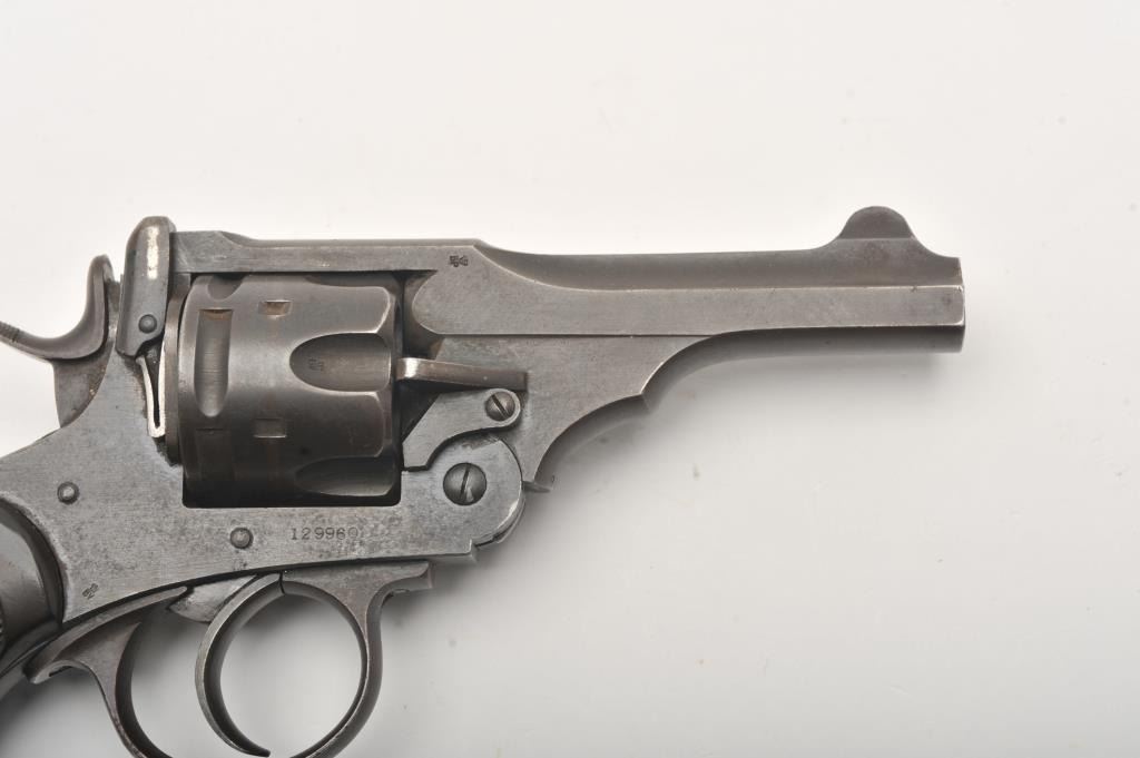 Webley Mark V DA top break revolver, .450/.455 caliber, 4” barrel, black finish, checkered hard rubber grips, lanyard ring, S/N 129960; overall good to very good condition with majority of original muted black finish on metal surfaces, good bore, crisp action, good markings and good grips. (C&R/PPT). Est.: $175-$350.