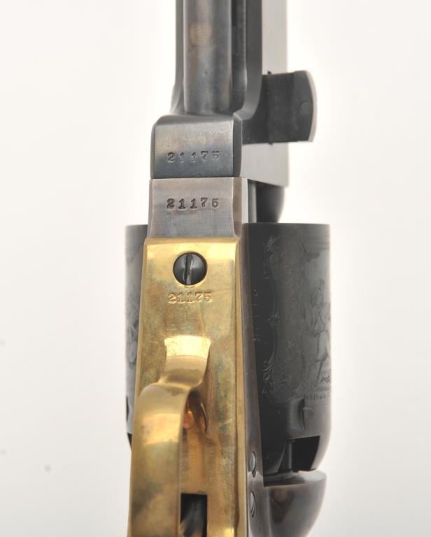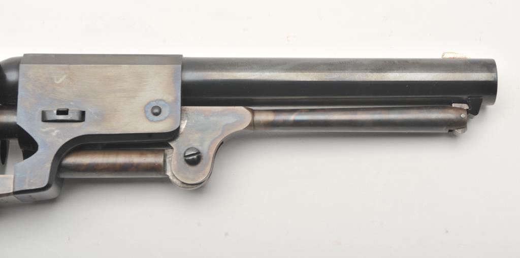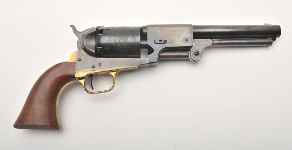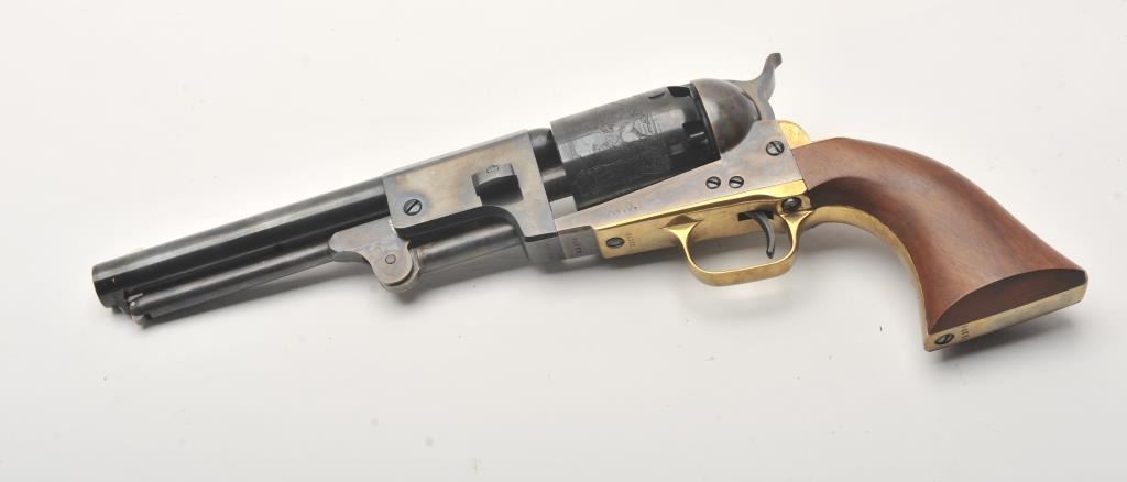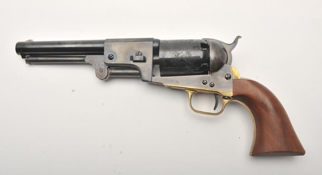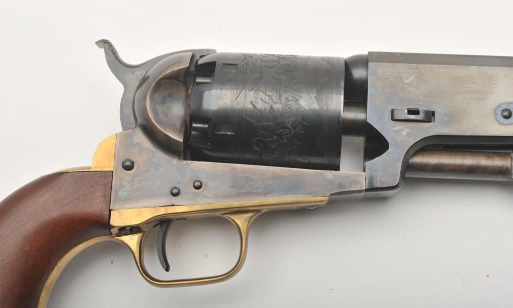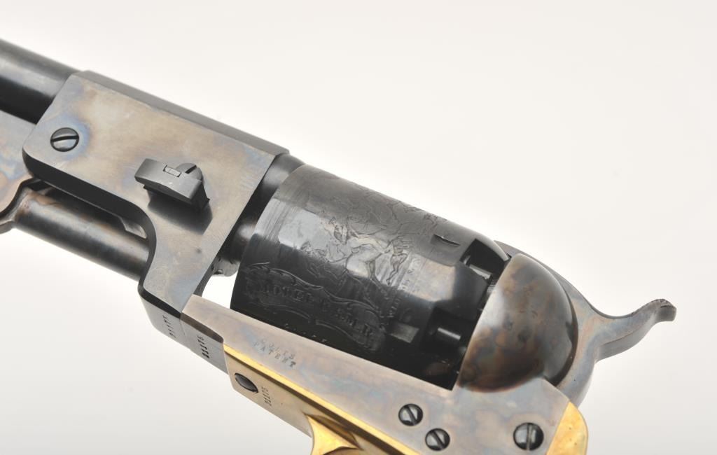 Colt New Black Powder Series 3rd Model Dragoon percussion revolver, .44 caliber, Serial #21175. The pistol is in fine overall condition with a 7 ½” round barrel. The barrel and cylinder retain nearly all of their blue finish with 95% of the cylinder scene visible including the engagement date. The frame, rammer and hammer are beautifully case hardened, while the trigger guard and back strap are finished in brass. The smooth wood grips are in very good condition with only light storage and handling marks. The bore is good, the action is crisp and markings are sharp. The pistol comes in the original factory woodgrain cardboard box. Est.: $500-$800.