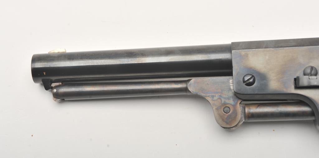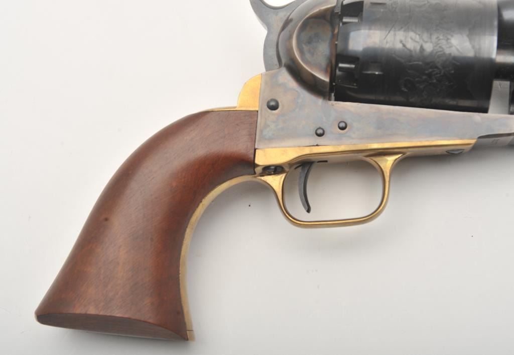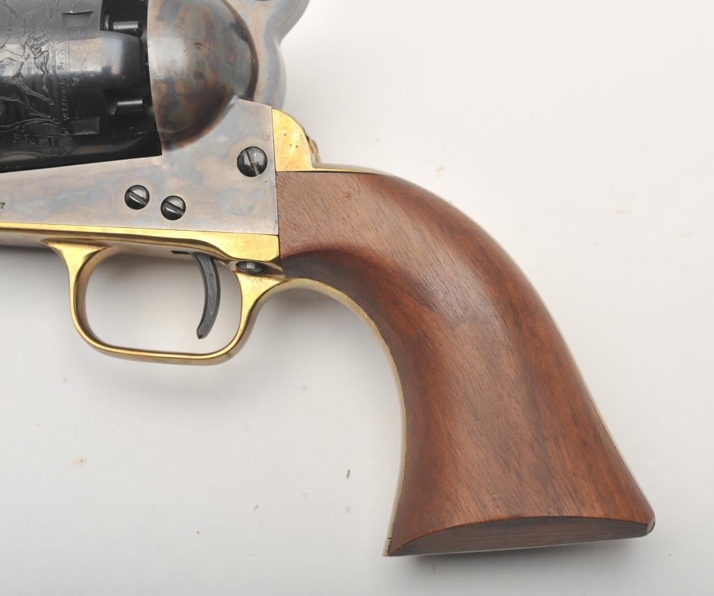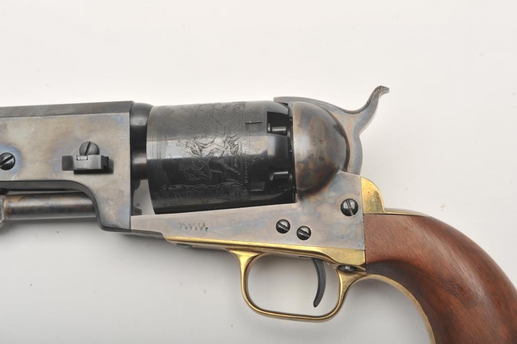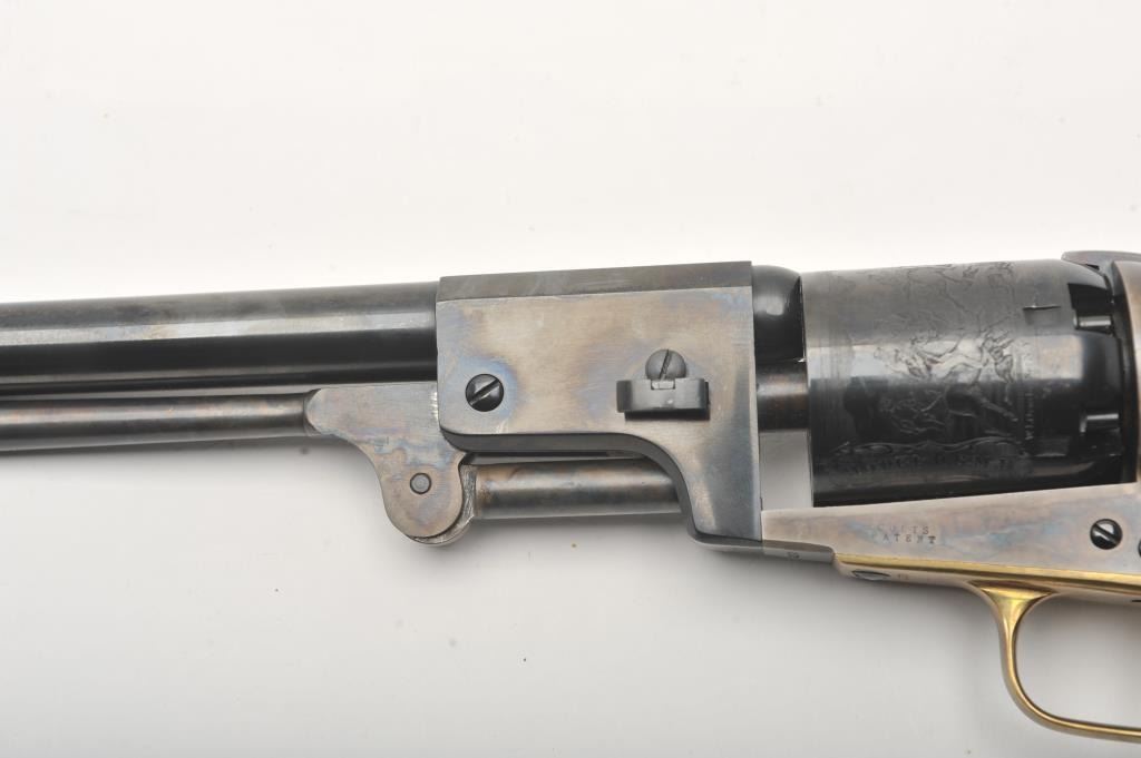 Colt New Black Powder Series 3rd Model Dragoon percussion revolver, .44 caliber, Serial #21175. The pistol is in fine overall condition with a 7 ½” round barrel. The barrel and cylinder retain nearly all of their blue finish with 95% of the cylinder scene visible including the engagement date. The frame, rammer and hammer are beautifully case hardened, while the trigger guard and back strap are finished in brass. The smooth wood grips are in very good condition with only light storage and handling marks. The bore is good, the action is crisp and markings are sharp. The pistol comes in the original factory woodgrain cardboard box. Est.: $500-$800.