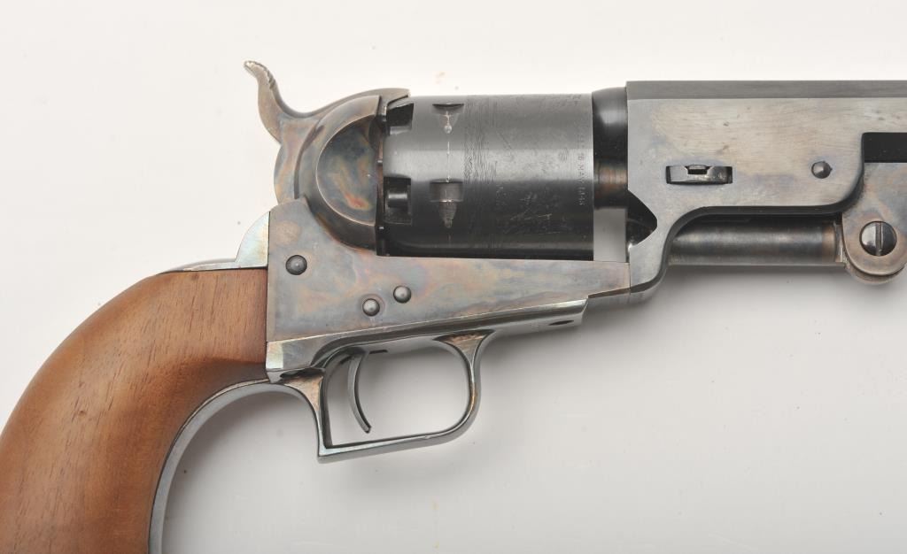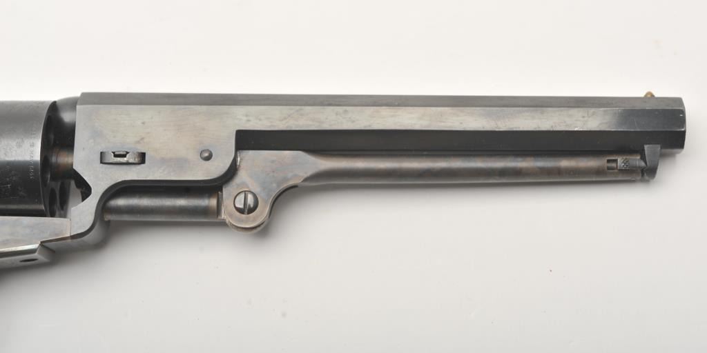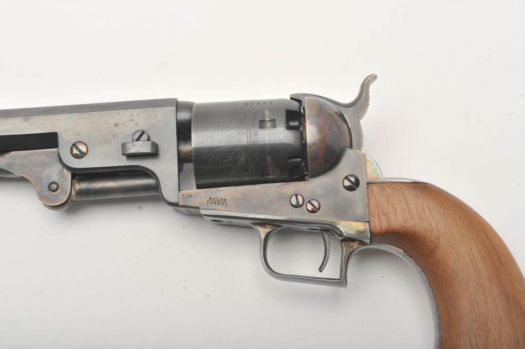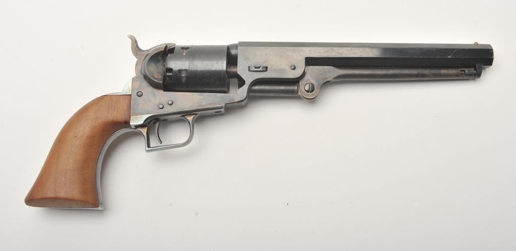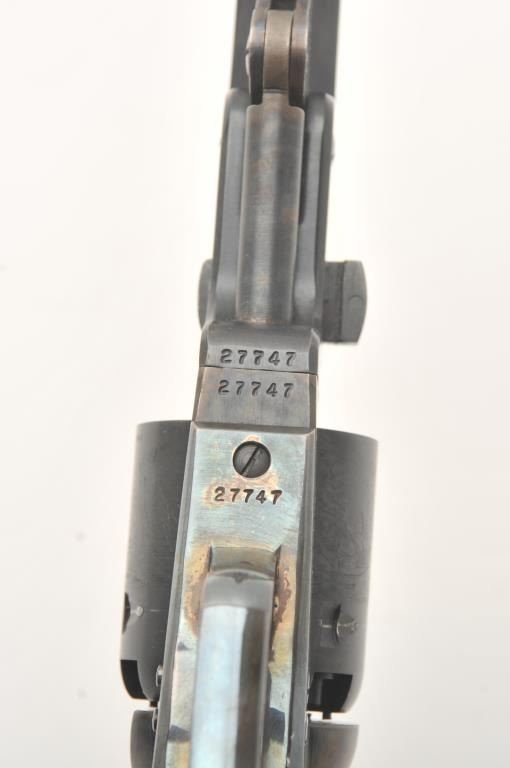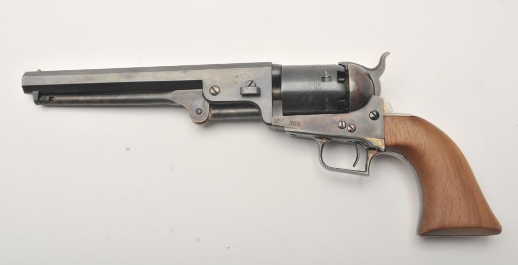 Colt New Black Powder Series 1851 Navy 2nd Model percussion revolver, .36 caliber, Serial #27747. The pistol is in fine overall condition with a 7½” octagon barrel. The barrel and cylinder retain nearly all of their blue finish with 95% of the cylinder scene visible including the engagement date and a faint drag line. The frame, rammer and hammer are beautifully case hardened and the back strap and square trigger guard are silver tone. The smooth wood grips are in very good condition with only light storage marks. The bore is good, the action is crisp and markings are sharp. Est.: $450-$850.