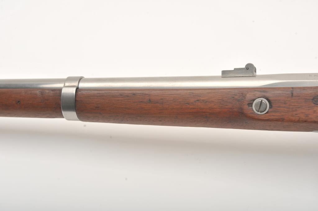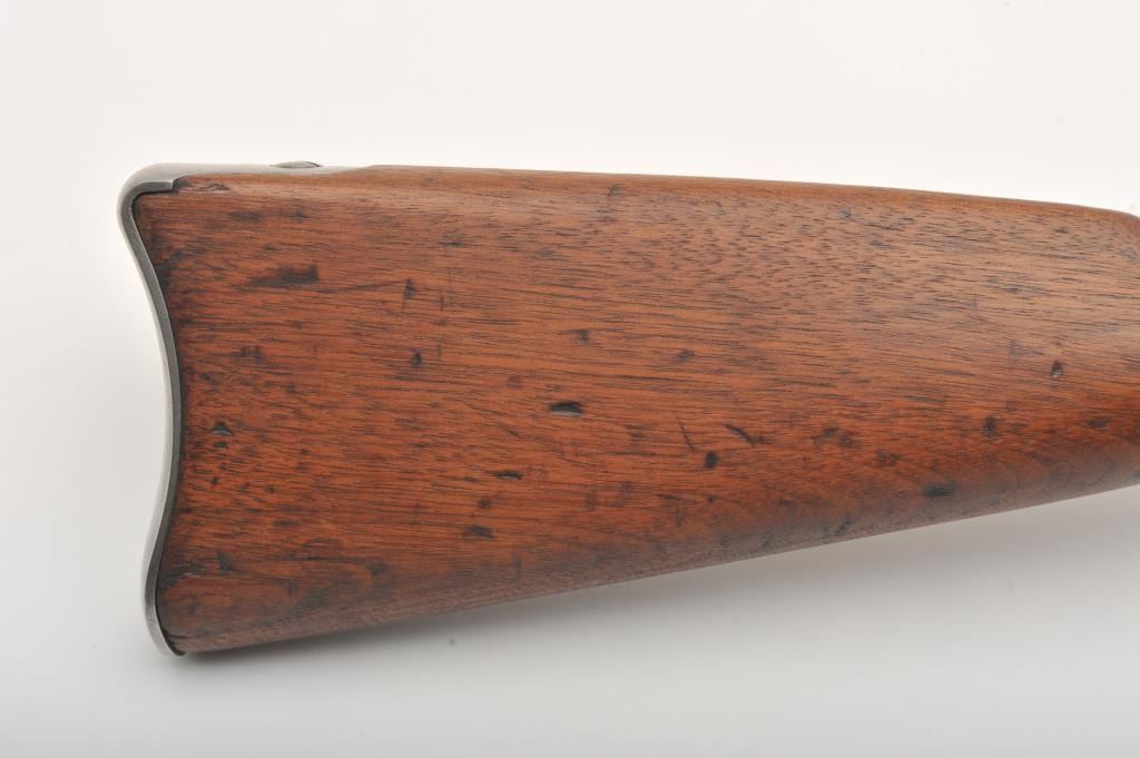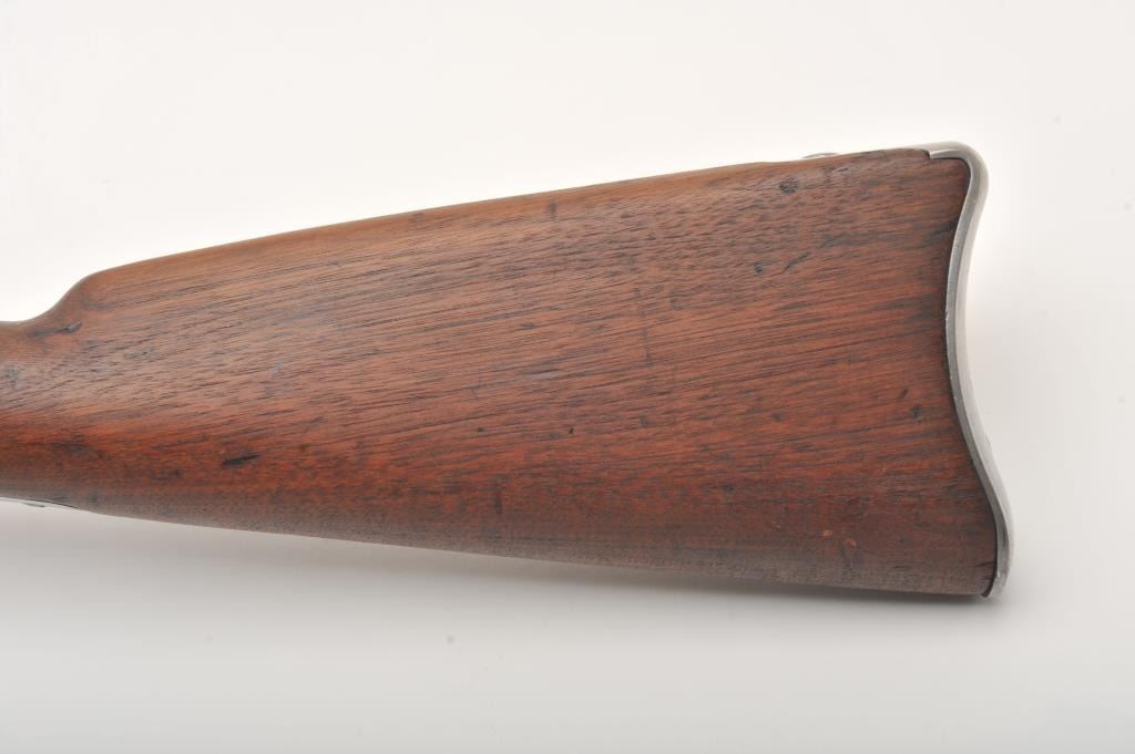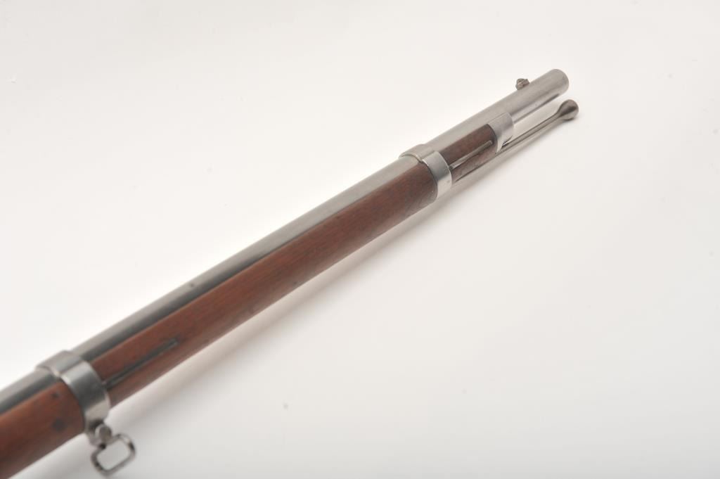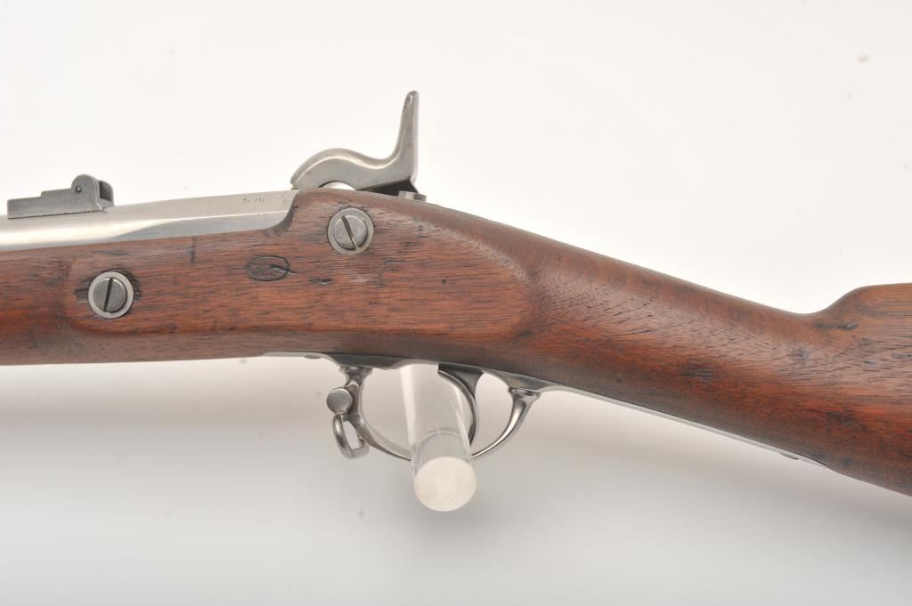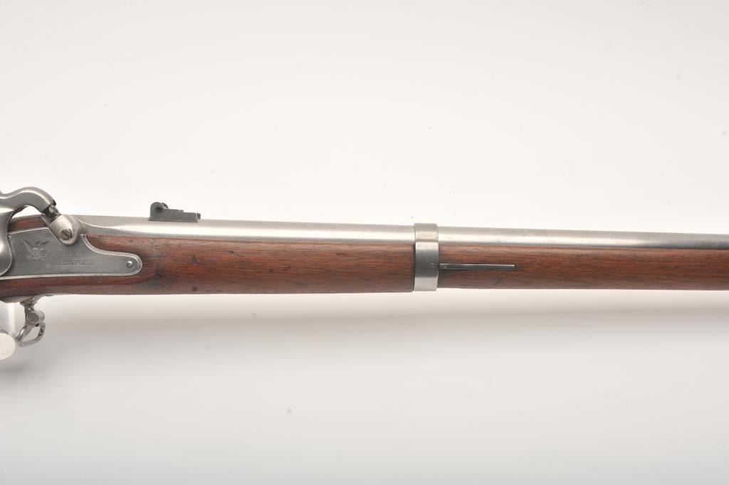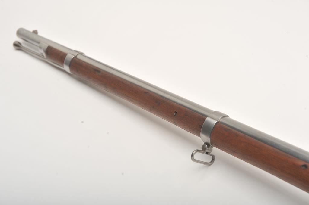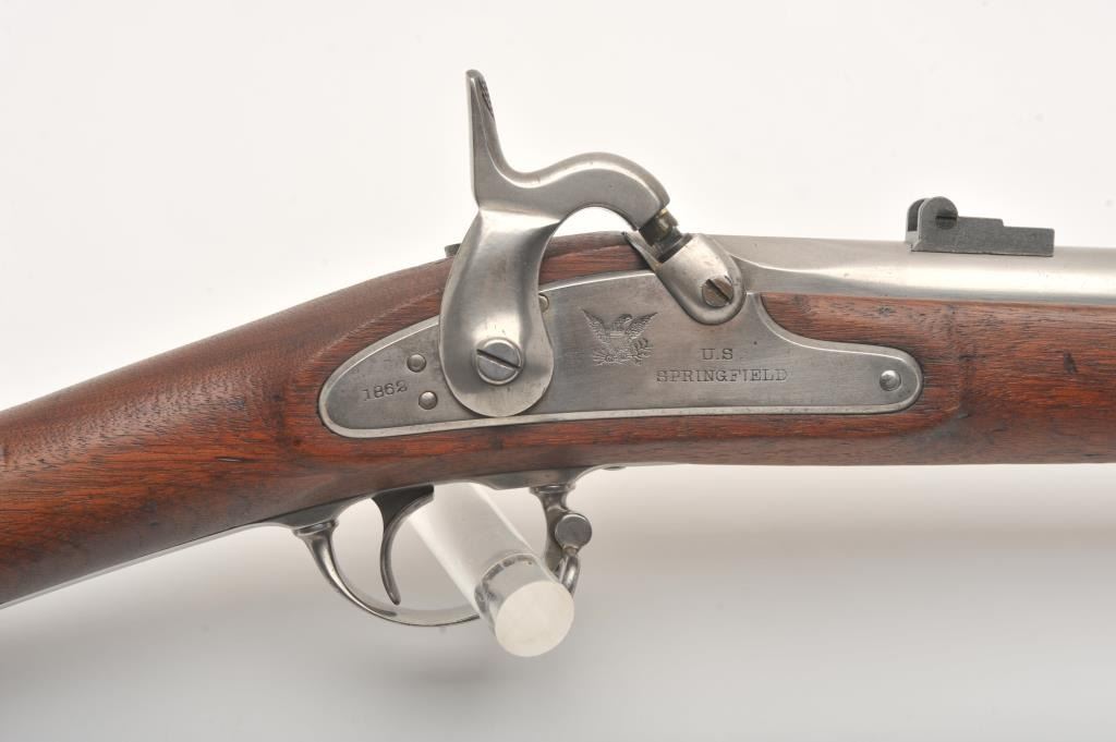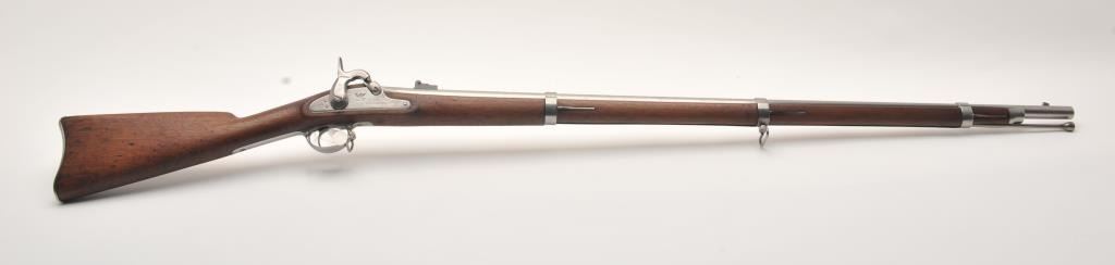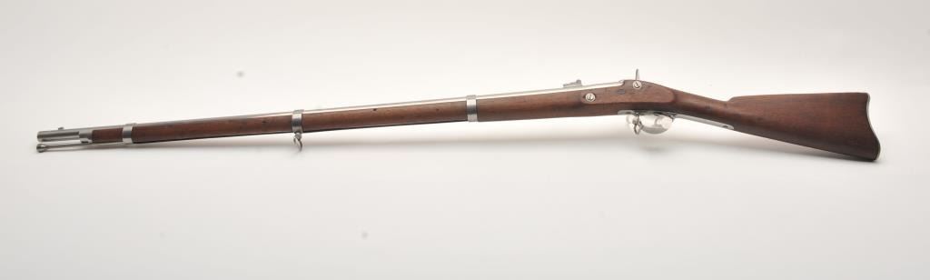 U.S. Springfield Armory Model 1861 percussion musket, .58 caliber, Serial #NSNV. The musket is in very good overall condition with a 40” round barrel. The metal surfaces are in the white with small mars and scratches from carry and use. The barrel bands feature military inspection marks, sling swivels and the ramrod is retained. The receiver side plate is US marked and stamped, “1862” at the rear. The smooth wood stock is in good condition with dents and compressions , ending with a US marked, smooth steel butt plate. The bore is fair, the action functions and the markings are legible. Est.: $500-$1,000. (Antique).