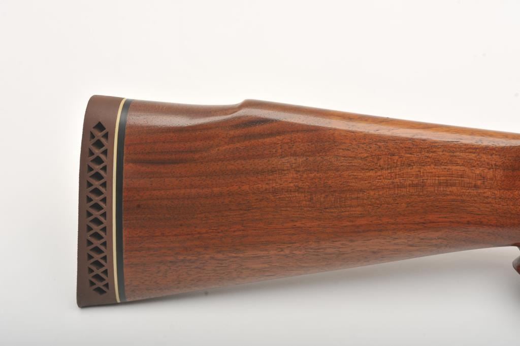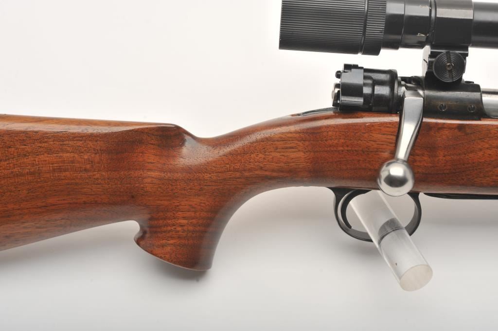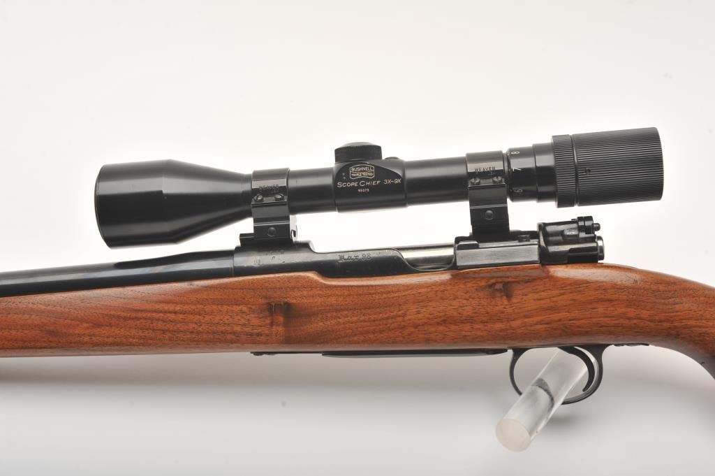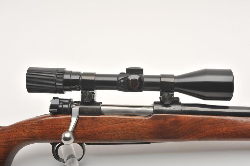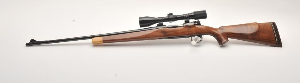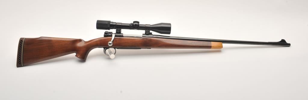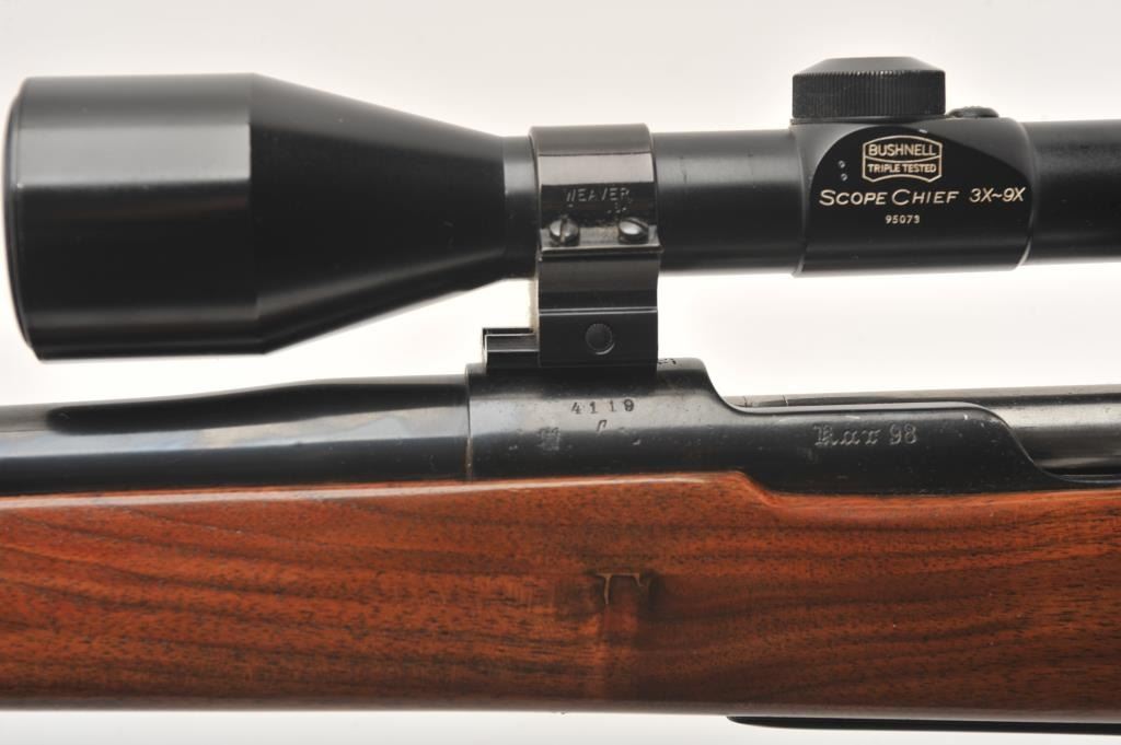 Custom Mauser bolt action sporting rifle, .270 Winchester, Serial #4119R. The rifle is in very good overall condition as customized with a 25” barrel. The metal surfaces retain the majority of an old quality re-blue. The barrel is not marked for caliber, but is chambered in .270 Winchester and glass bedded, per the consignor. The action is smooth and the trigger has been upgraded with a Timney replacement. The smooth wood custom stock is in good condition with an Alder fore end cap, cheek piece and nice figure to the wood. A Pachmayr ventilated rubber pad has been added providing a 14” LOP. The rifle is topped with two-piece Weaver mounts and rings and a Bushnell Scopechief 3 x 9 x 40 variable power scope with a post and cross hair reticle. The bore is good, the action is smooth and the custom work on this rifle is well accomplished. Est.: $400-$800. (C+R).
