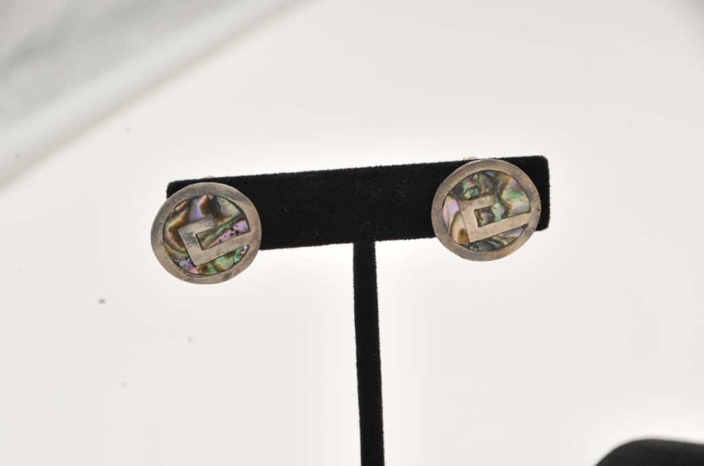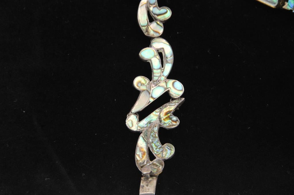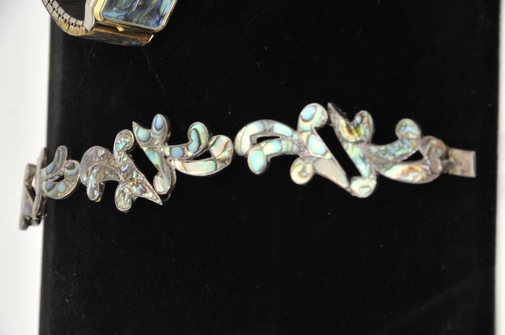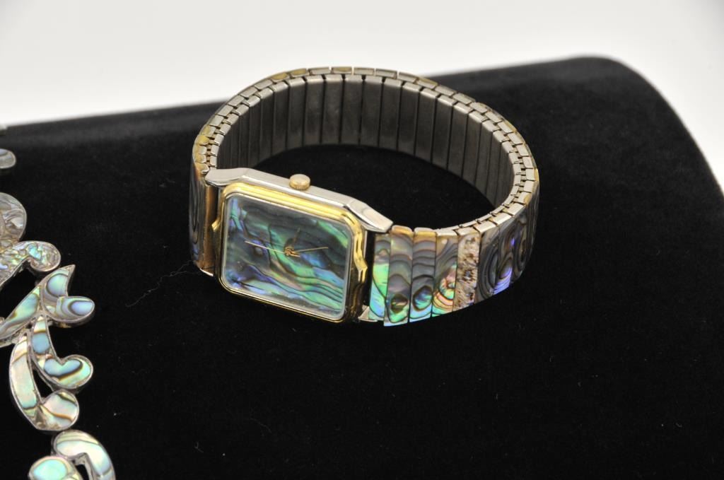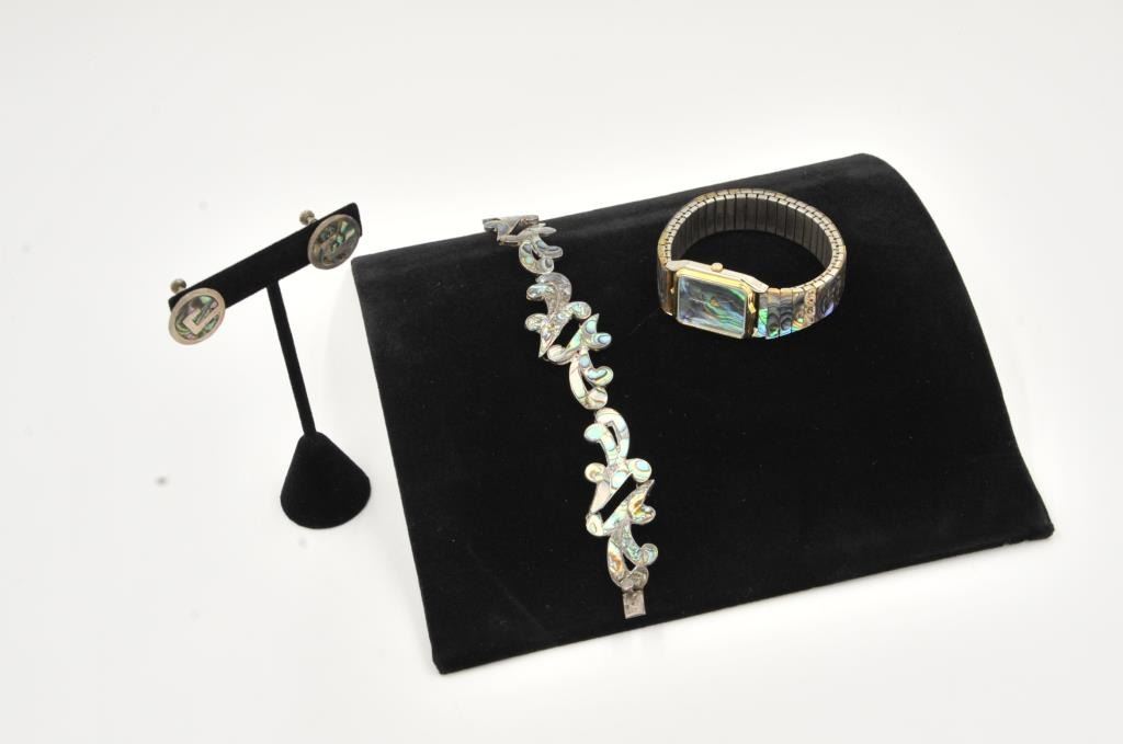 Sterling silver bracelet, matching earrings and watch inlay-ed with multicolored abalone Est:$300-400
