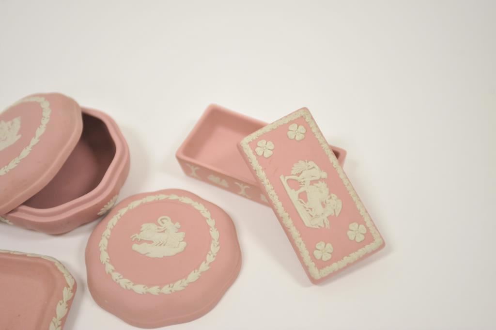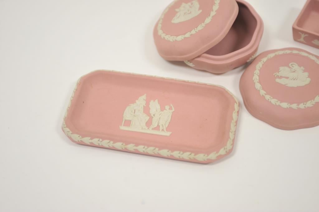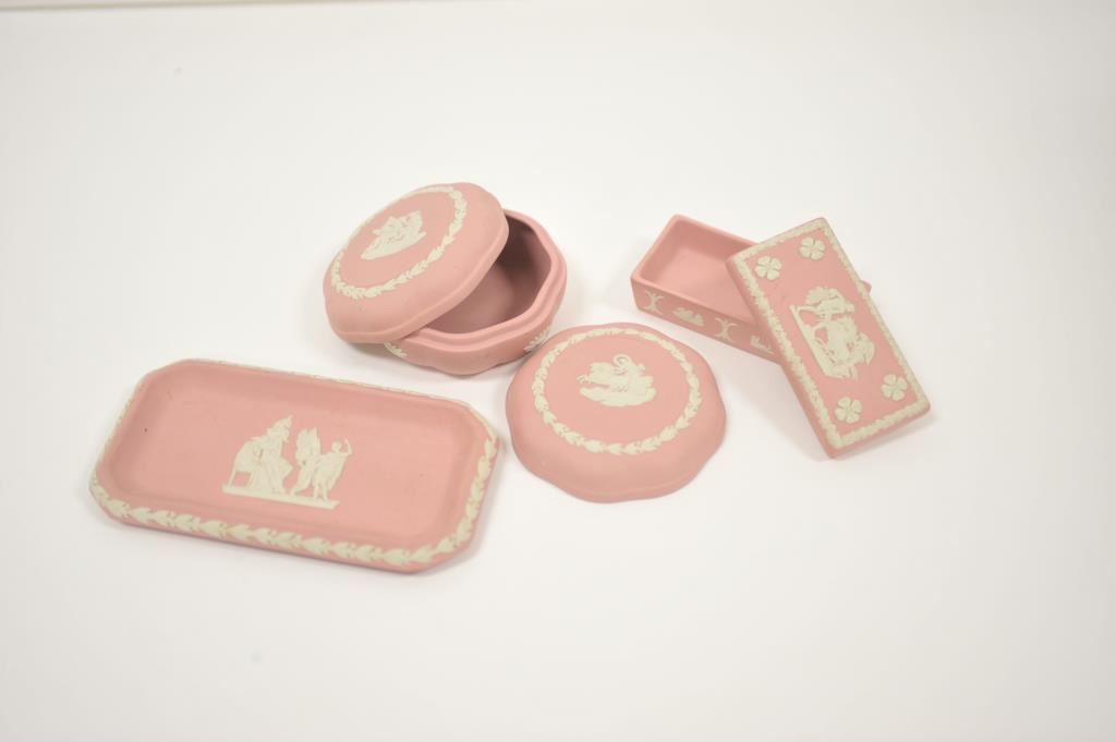 3 pieces of Wedgwood pink/white rectangular and round trinket boxes and a matching display tray. Est:$300-400