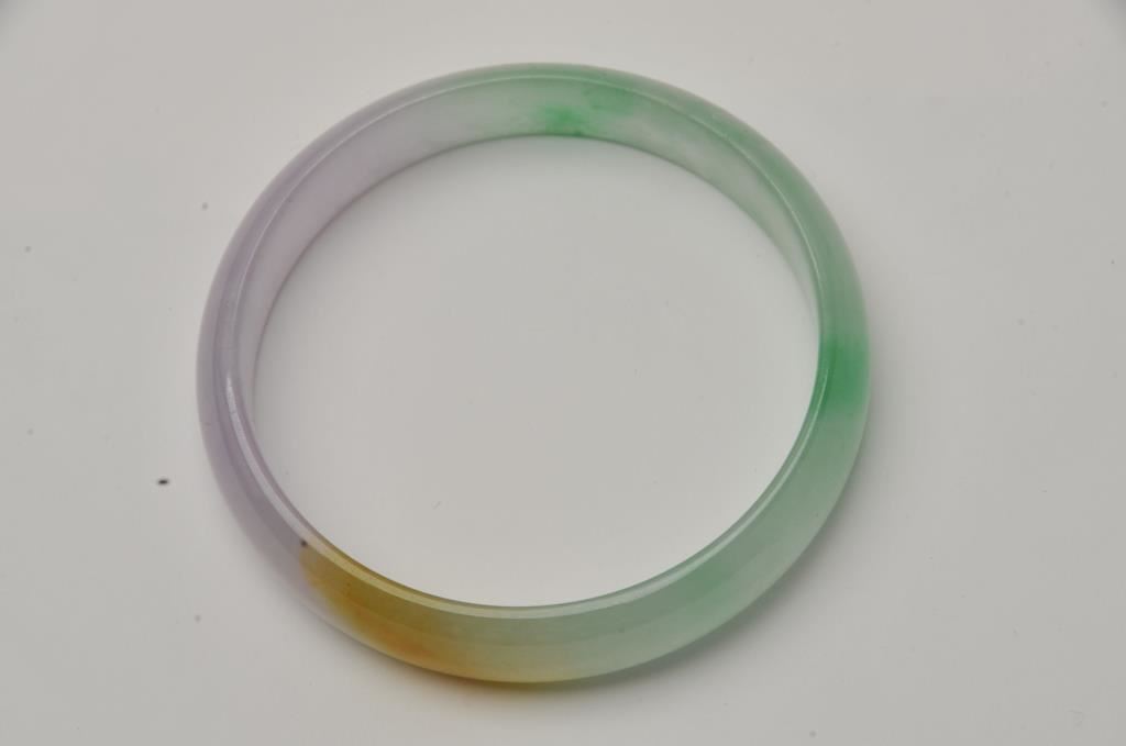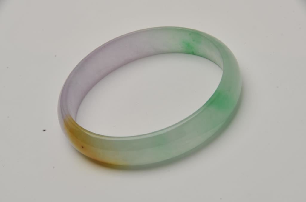 One unusual green, lavender and yellow jade bangle bracelet Est:$250-350