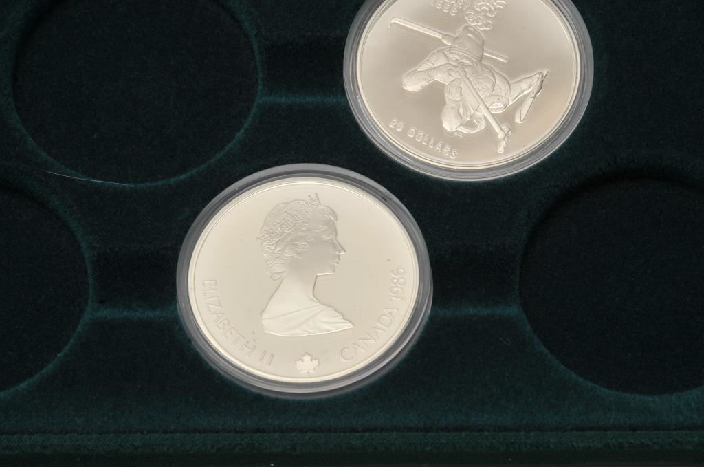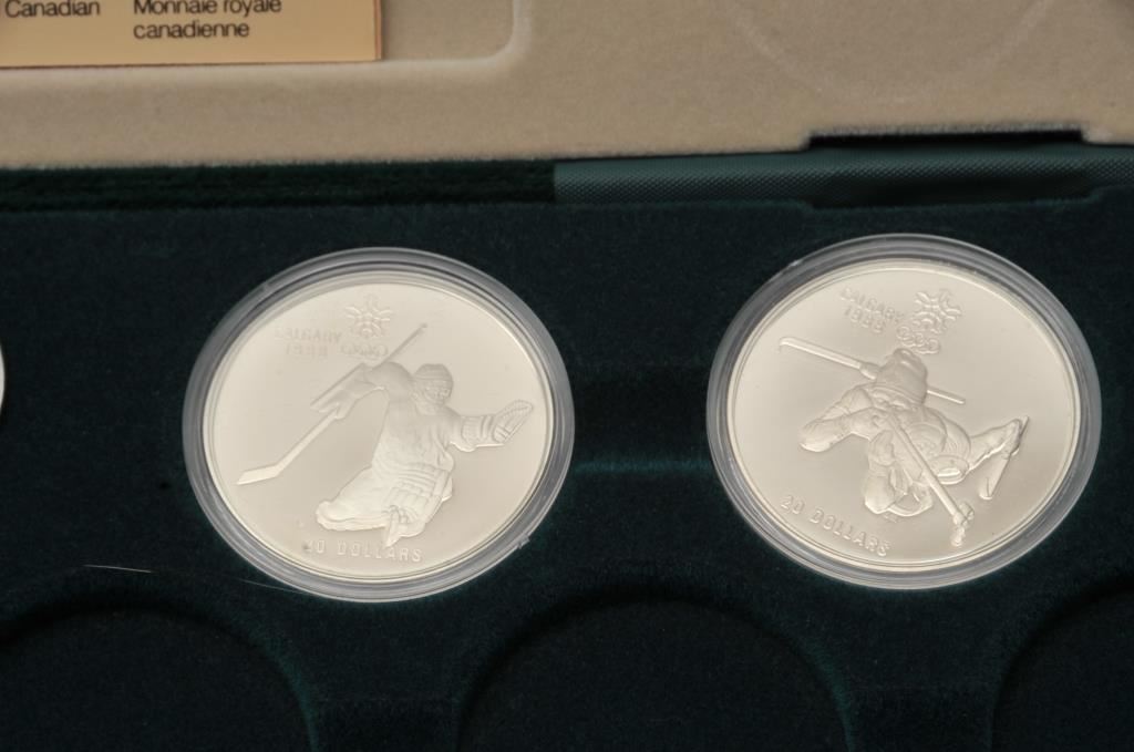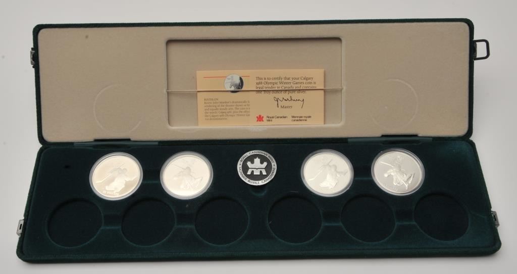 4 proof Canadian Olympic 20 dollar coins in presentation box with papers., containing 4 ounces of pure silver. Est:$150-300
