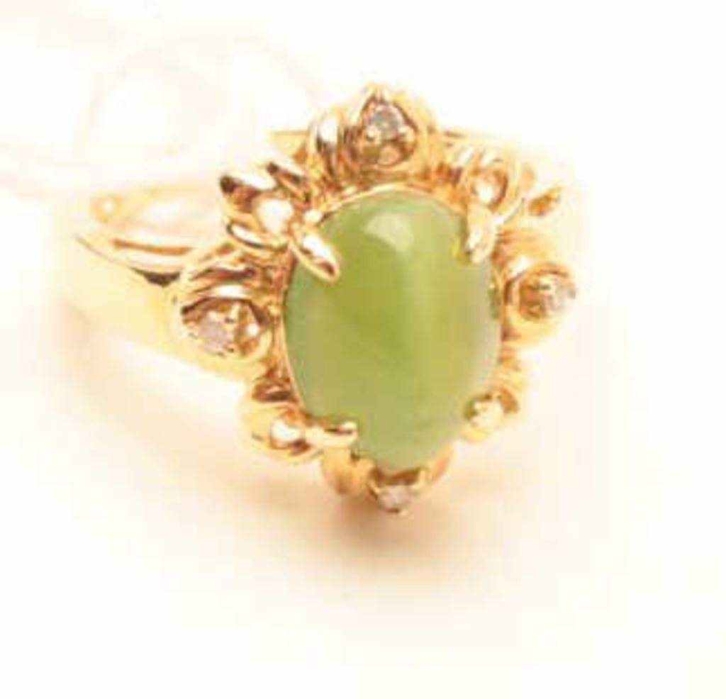 One rare chrysoberyl cats'eye weighing approx 3ct mounted in 14k yellow gold ring with 4 side diamonds Est:$1000-1500