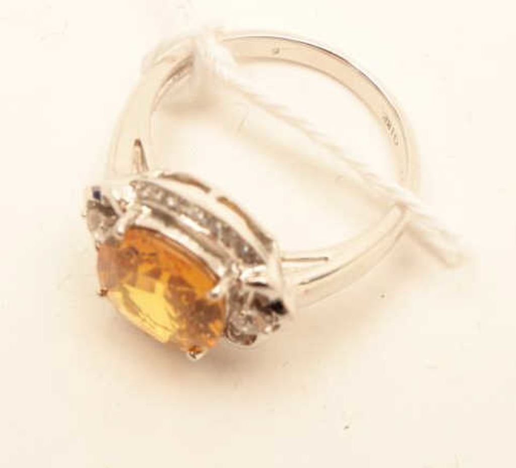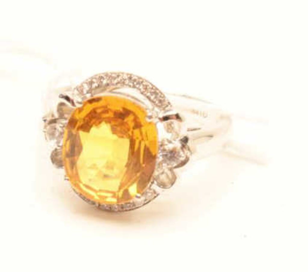 One fine rare yellow sapphire weighing approx 6cts with side diamonds in 18k white gold. Est:$3000-4000