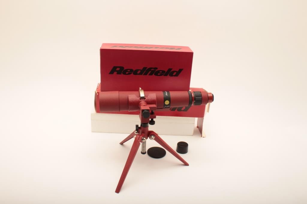 Redfield 15 x 60 variable power spotting scope and tripod base. The spotting scope and base are in the factory box with all associated packaging materials. The scope and tripod are in very good condition with clear crisp optics. Est.: $100-$200.