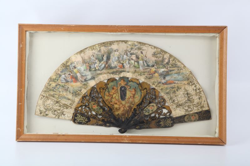 18th Century French Rococo hand-painted paper and ebony wood fan, shadow box framed, wire hanger. Four-scene, hand-painted enamel over print depicting women in flowing garb, some children, natural landscape. The sticks appear to be ebony wood, open scrollwork design, painted with gold, putti and floral motif, small silver glass mirror in middle. Natural wear to edges and paint loss due to age. Overall, very good condition.