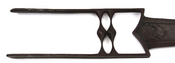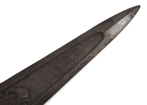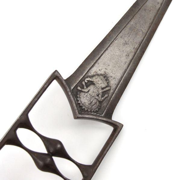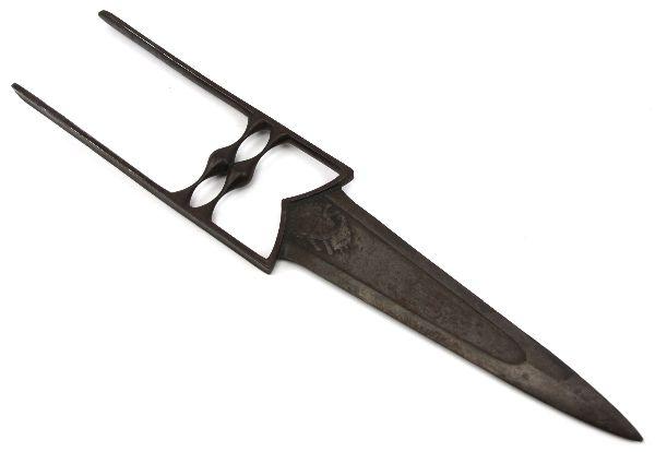 18th Century Indian Katara push dagger. Complete iron construction, with approximately 9 inch double edged blade, and just under 18 inch total length. Relief image if elephant headed Hindu deity Ganesha (aka Ganesh or Ganapati) on both sides of blade. Dark mellow patina, and sharp edge. Excellent example in very good condition, With copy of COA.