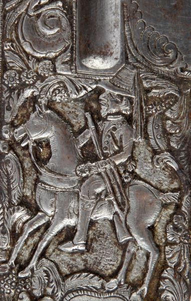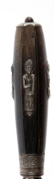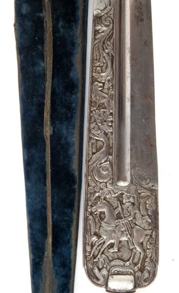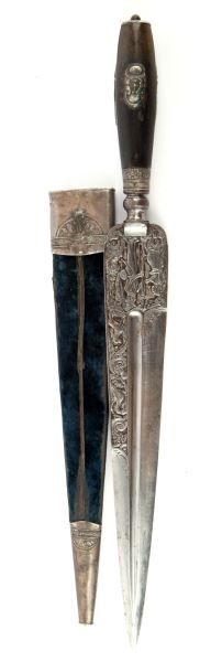 Finely crafted 18th century poignard dagger. Style and shape are consistent with styles carried amongst aristocracy in the Mediterranean region of Sardinia and southern Italy. Central fullered spear point blade measures 11.5 inches, with balustered bolster, silver ferrule, horn grips with high relief silver insets, and silver pommel. 5.5 inch false edge on top of blade leads to flat edge engraved with what appears to be "non ti finor da me se il cor ti marchio no mi cuore", and "senza ragione" on lower shoulder. Blade is finely engraved in high relief with what appears as a gentleman bidding farewell to a woman on one side, and on horseback on the other, and the balance in floral scroll and animals. Scabbard is blue velvet over wood, with silver throat and chape. Some wear to velvet on scabbard, and a few dings to throat. Dagger itself in in excellent condition, presenting an exceptionally fine example of its kind. This lot has a reserve.