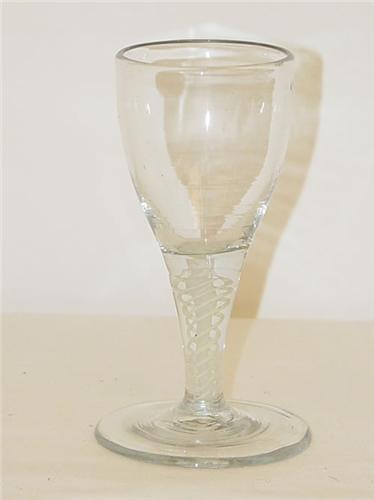 18TH CENT. BLOWN GLASS WINE W/ WHITE AIR TWIST STEM, ROUND BASE & TAPERED SIDES (4 3/4" T) - GOOD CONDITION