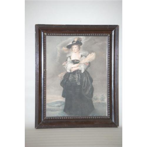 18TH CENT. BRITISH COLORED ENGRAVING PORTRAIT OF "HELEN W/ OSTRICH FEATHERS" FROM PETER PAUL RUBINS PAINTING OF HIS YOUNG WIFE-ENGRAVED BY THOMAS CHAMBERS LONDON ENGLAND IN A CARVED WOODEN FRAME (18 1/4" X 14") - WEAR, TEARS, TONING, IMPERFECTIONS