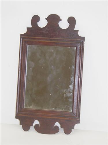 18TH CENT. CHIPPENDALE MIRROR W/ CARVED EARS & CRESTS & OLDER FINISH (20" T X 11" W) - MIRROR REPLACED, WEAR & IMPERFECTIONS;
