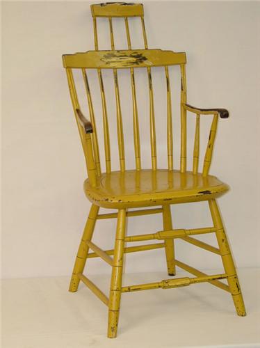 18TH CENT. COMB BACK STEP DOWN WINDSOR ARM CHAIR W/ PLANK SEAT, SHAPED STRETCHERS & SCROLLED ARMS IN LATER MUSTARD PAINT W/ LEAFY PAINTED DECORATION - WEAR & IMPERFECTIONS