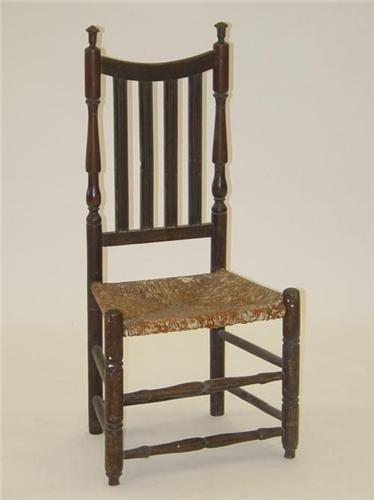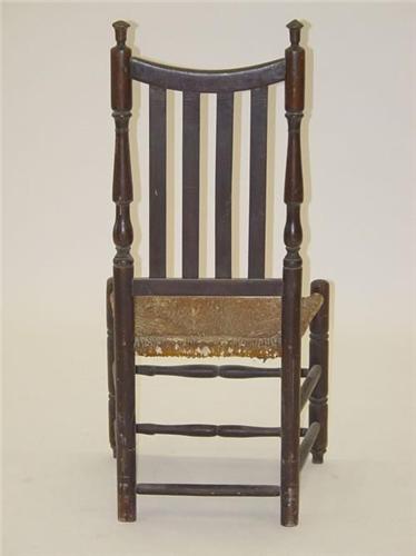 18TH CENT. CT BANISTER BACK SIDE CHAIR W/ 4 GROOVE CARVED BANISTERS, TURNED FINIALS, POSTS, LEGS & STRETCHERS & RUSH SEAT IN OLD MAHOGANIZED FINISH (PROBABLY MAPLE)(40 1/2" T X 19 1/4" W X 14 3/4" D) - WEAR & IMPERFECTIONS