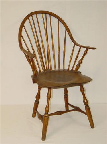 18TH CENT. CT CONTINUOUS ARM BRACE BACK WINDSOR CHAIR W/ SADDLE SEAT & TURNED MEDIAL STRETCHER SIGNED EB TRACY (EBENEEZER) - REPAIRS, IMPERFECTIONS