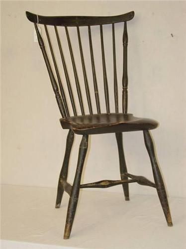 18TH CENT. FAN BACK WINDSOR CHAIR W/ SHAPED SADDLE SEAT & SPLAY LEGS IN BLACK PAINT W/ PAINT DECORATED CREST - WEAR TO PAINT, IMPERFECTIONS;