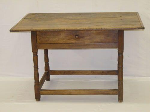 18TH CENT. NEW ENGLAND PINE & MAPLE TAVERN TABLE W/ DOVETAILED DRAWER, TURNED LEGS & BOX STRETCHER W/ RECTANGULAR OVERHANGING TOP W/ BREADBOARD ENDS (27 1/4" T X 44" W X 29 1/2" D) - WEAR, REPAIRS & IMPERFECTIONS