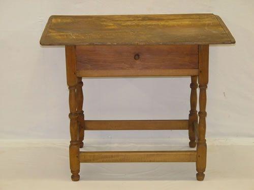 18TH CENT. NEW ENGLAND PINE & MAPLE TAVERN TABLE W/ RECTANGULAR OVERHANGING PINE TOP W/ BREADBOARD ENDS, DOVETAILED DRAWER, TURNED LEGS & BOX STRETCHER (25 1/2" T X 32" W X 24" D) - WEAR & IMPERFECTIONS