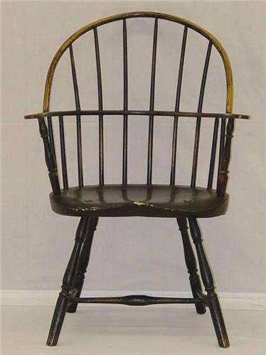 18TH CENT. NEW ENGLAND SACK BACK WINDSOR ARM CHAIR IN BLACK PAINT - WEAR and IMPERFECTIONS;