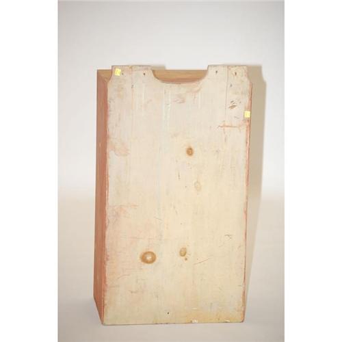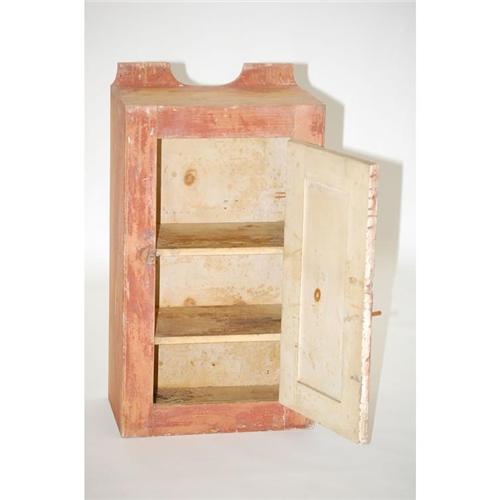 18TH CENT. PAINTED NEW ENGLAND WALL CUPBOARD - PINE DOVETAILED & PEGGED WALL CUPBOARD W/ RAISED PANEL DOOR, ORIGINAL WOOD LATCH, PEG HANDLE & WROUGHT IRON HINGES IN OLD RED PAINT (34" T X 19" W X 12" D) - WEAR & SMALL LOSSES, IMPERFECTIONS