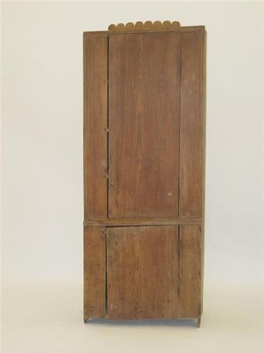 18TH CENT. SOUTHERN PINE PRIMITIVE 2 DOOR STEPBACK CUPBOARD W/ PICTURE FRAME MOLDING & 8 LOBED CREST IN NATURAL SURFACE (FOUND IN GREENSBORO NC)(75" T X 29 1/4" W X 15" D) - WEAR & IMPERFECTIONS