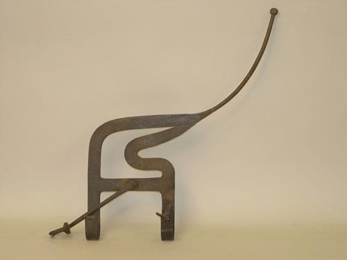 18TH CENT. WROUGHT IRON POT OR KETTLE TILTER (HEARTH EQUIPMENT)-FRAME W/ HOOKS FOR KETTLE HANDLE ON GIMBLED CRANE ATTACHMENT W/ LONG CURVED HANDLE (22" T X 16" W X 26 1/2"-DIAGONAL) - WEAR & IMPERFECTIONS