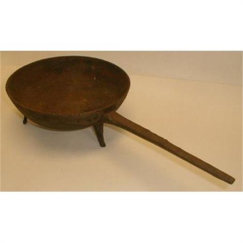 This is a large size 18th century cast iron 3 legged cooking/hearth pot with a side handle. It is 10" in diameter and is 4 1/4" high.....19 1/4" total length with the handle. There is a 1" line on the outside that doesn't appear to go through to the inside as a crack. This pot is in very good condition considering its age and purpose.