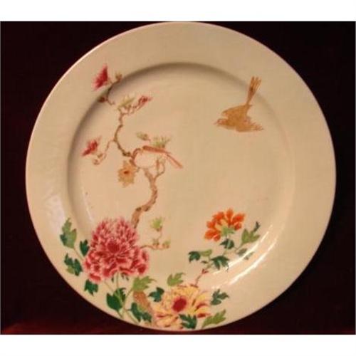 Circa 1750-1770 Chinese Export 15" Charger in Famille Rose with birds, pink and yellow flowers with a bird resembling a eagle flying in and another bird resembling a swan perched in a tree that bears beautifully painted pink, yellow and rustic orange flowers. This is a wonderful example of famille rose at it's best. Not to mention the beautiful light pale gree background that reminds me of a light shade of celadon. Excellent Quality and in Very Good Condition. No Restoration.