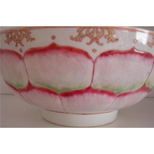 Circa 1750-1770 Chinese Export Rare Lotus Bowl 10" in Diameter with Pink and Green Lotus Leaves. 4 1/4" in height and depth. This Bowl was made for the Islamic Market. Wonderful Pink and Green Double Lotus Leaves. Fresh out of a Florida Estate.