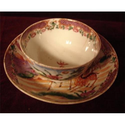 C. 1760-1780 Chinese Export Mandarin Palette set of 4 cups and saucers in the extremely rare Deer Pattern. The saucers are all perfect. The cups have a few minor chips and tiny hairlines. This pattern is very rare and most uynusyal. The saucers are a shade over 4 1/2" in diameter and are 1 1/8" in depth. The cups are 3" in diameter.