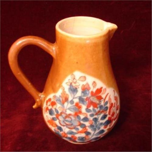 Circa 1770 Chinese Imari decorated cream or milk jug with a background that reminds me of choclate brown mocha ware. Very unusual combination that I have never seen before. The mug measures 5 1/4" in height. Their is a hairline just left of the handle which runs about 2". Also a few firing marks in the brown mochoa near the base. This is a combination with the chinese imari that I have never seen before. Fresh out of a home in the historic district of Charleston, South Carolina.