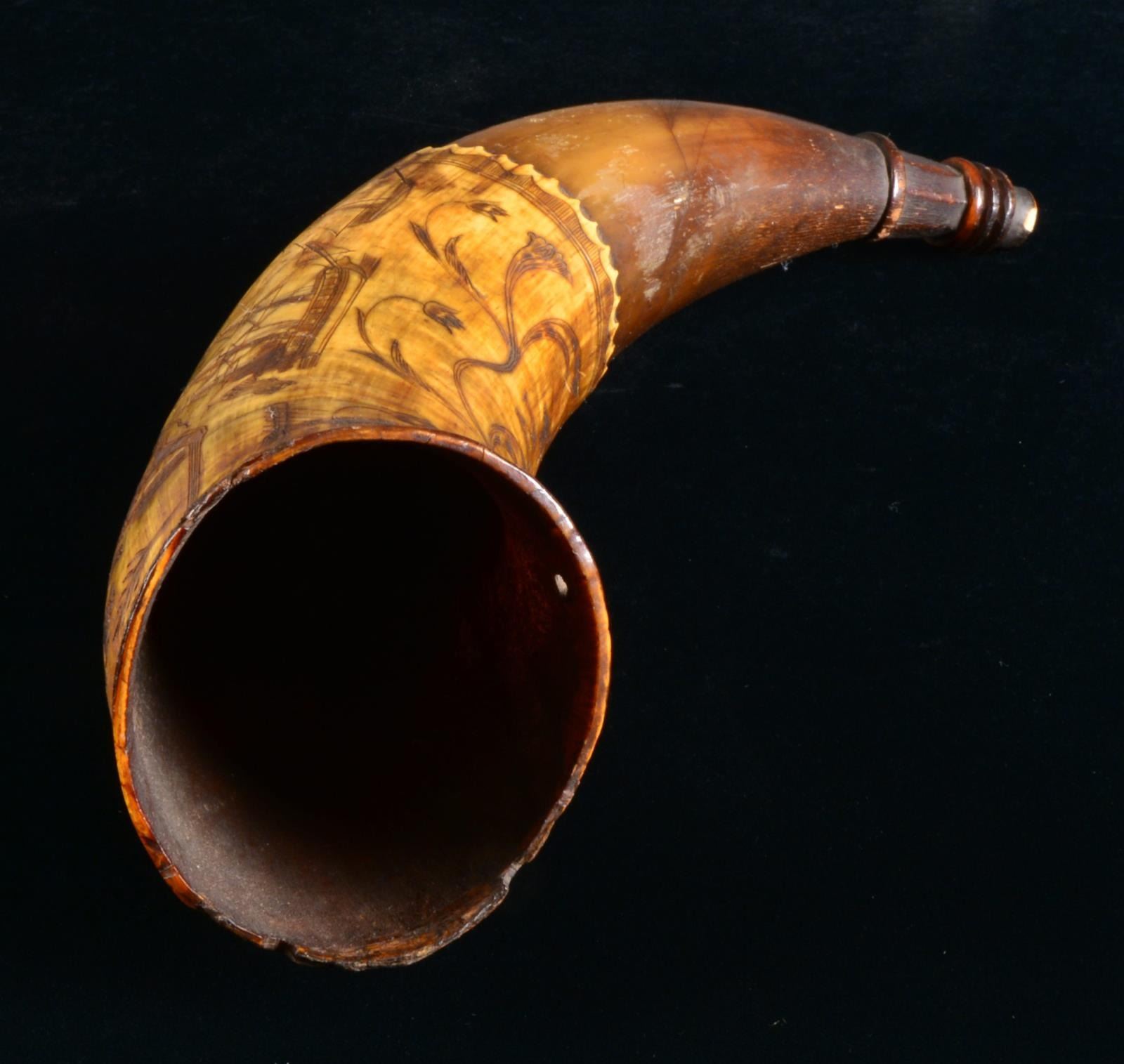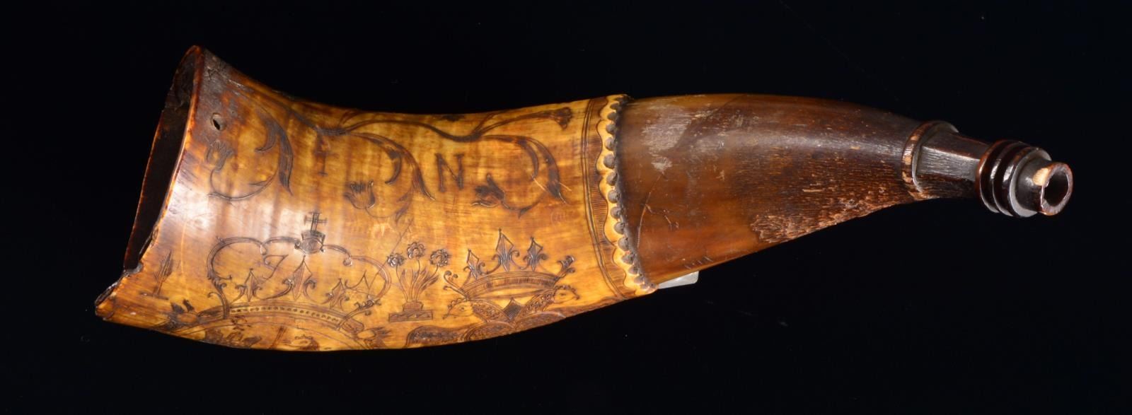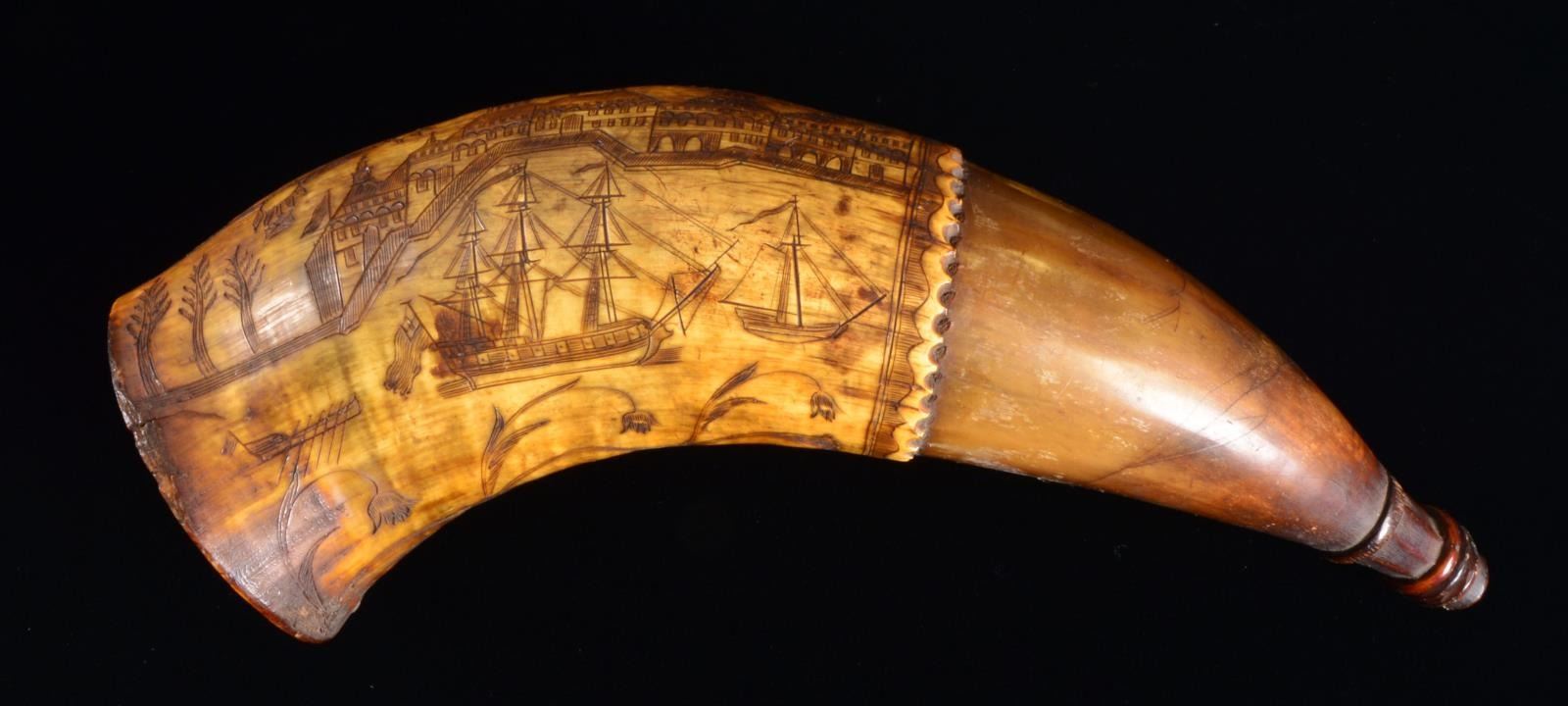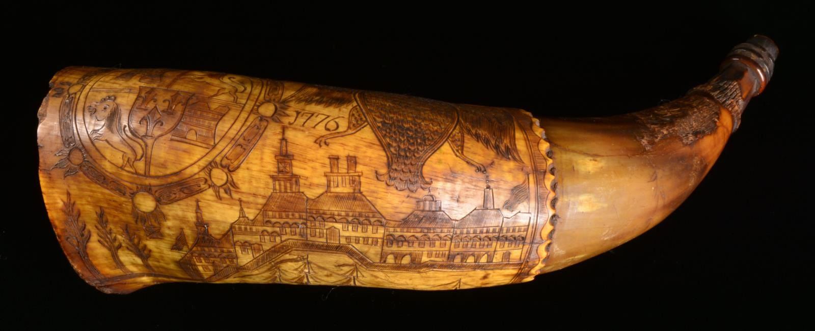 1776. Horn measures approx. 10 1/4" in length. A fine original 18th century horn w/ engraving that reflects many cultures & nationalities. 1 Lg. crowned crest shows the Arms of Castile superimposed by a central shield bearing 3 fleur de lis. An adjacent crest shows a crowned double headed eagle similar to the Holy Roman Empire eagle but w/ a heart on the chest. Between the 2 crests is the date “1776”. Below the crest, a 7 building town scene is depicted w/ 2 striped flags flying that are reminiscent of very early American Revolutionary War era flags. The 3 masted ship of war in the harbor flies a British naval ensign. There are 2 other smaller ships in the harbor. Below the harbor scene is a lg. bell flower vine w/ the initials “TN” in the center. An extremely interesting horn w/ fascinating iconography worthy of further research. CONDITION: wooden butt plug is missing. There is notable wear in the area that rubbed while being carried. Carving is exceptionally well executed. Particularly notable in the town scene & the feathering of the eagle. (02-13574/BF). $1,200-1,600.