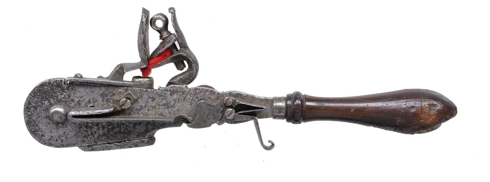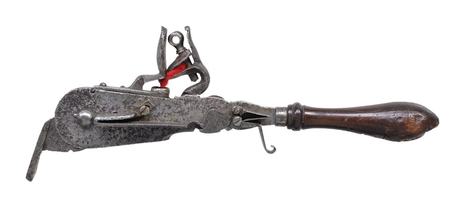 Eprouvette measures 9 1/2" in length & utilizes a flintlock ignition system. The turned wooden handle is 3 3/4". The front of the eprouvette has a graduated number scale to evaluate the potency of the black powder being tested. Eprouvette appears functional but does show its great age. CONDITION: iron parts generally show cleaned pitting w/ a medium gray patina. Handle has notable losses particularly on the underside. (02-14009/BF). $500-800.