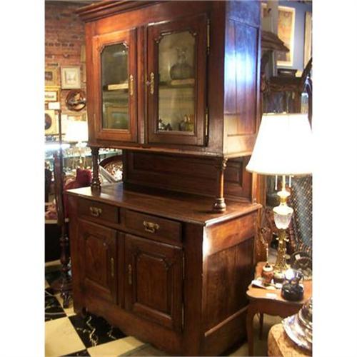 THIS CUPBOARD IS RICH IN ITS WOOD, DESIGN AND PRESENCE. IT IS HANDMADE OF AUTHENTIC FRENCH WALNUT,WITH TWO DOOR TOP,AND A SOLID TWO-DOOR BOTTOM.THE CUPBOARD IS TWO PART. BOTH TOP AND BOTTOM HAVE ONE SHELF. THE HARDWARE IS ORIGINAL.