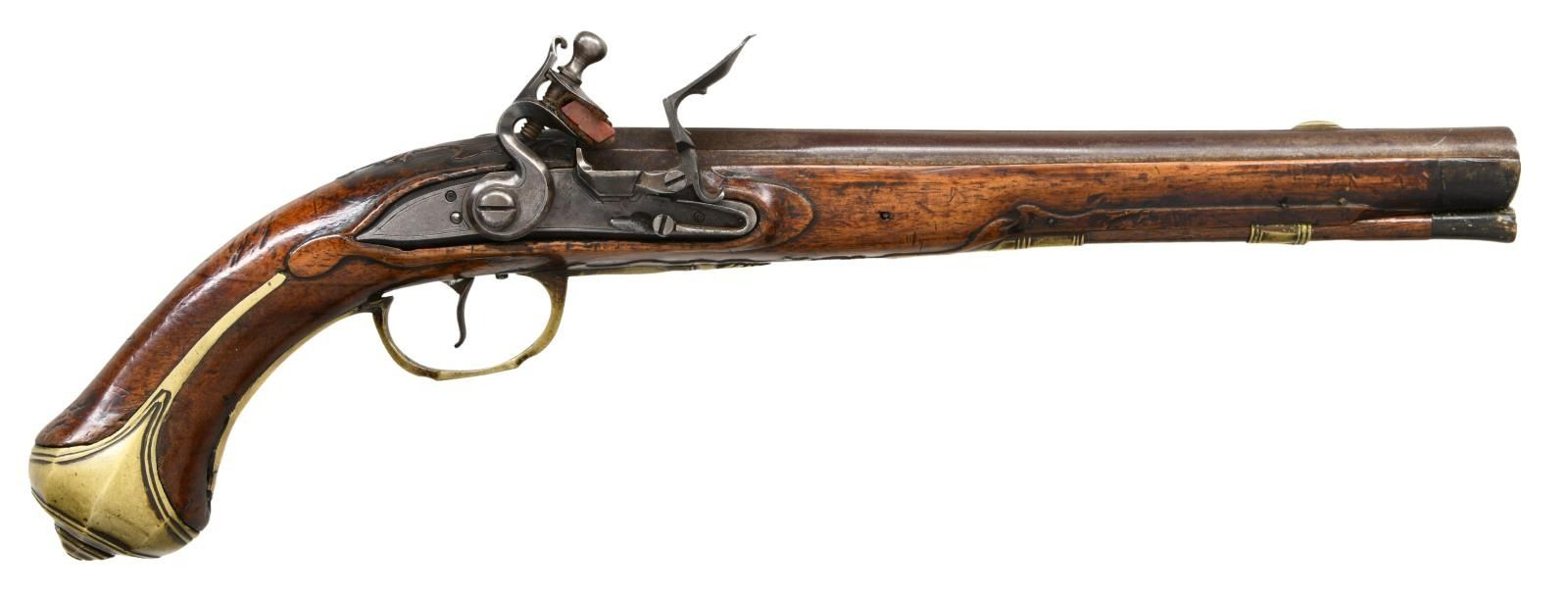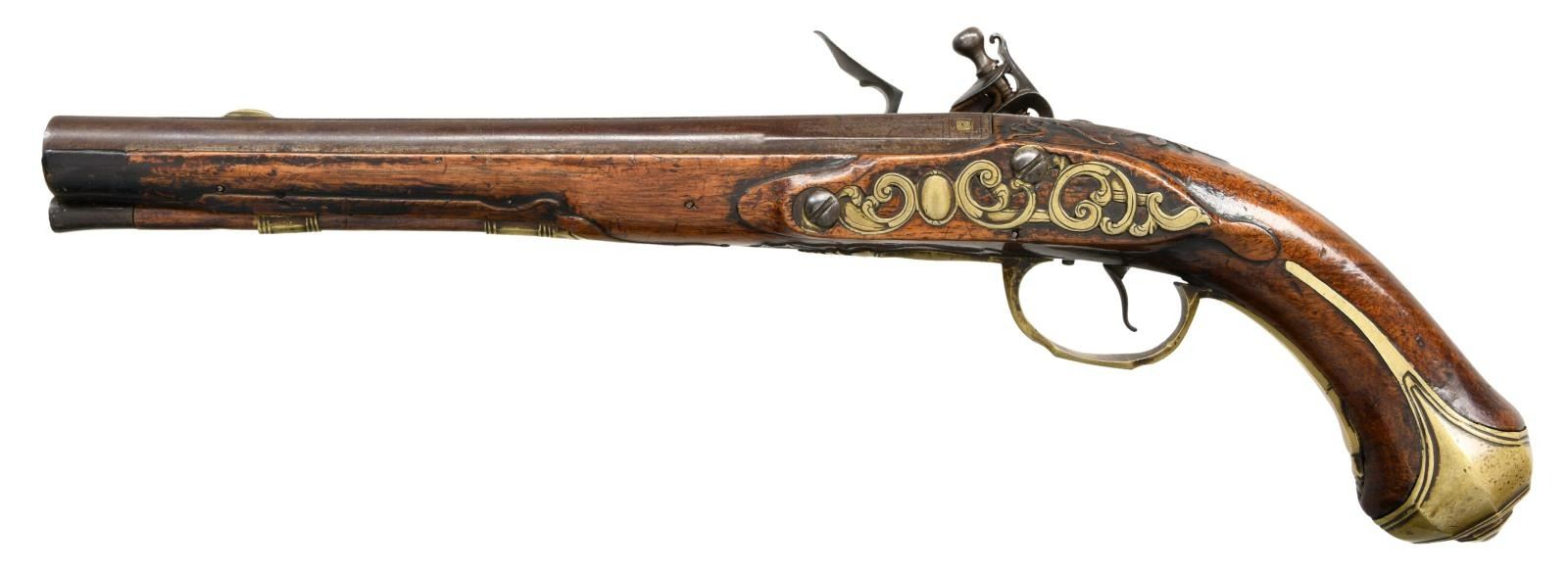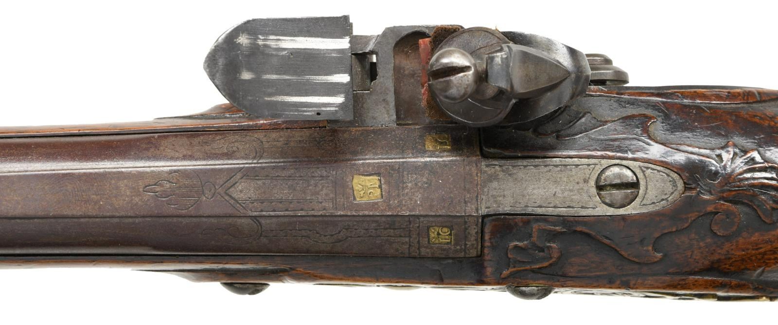 Cal. 62. S# NSN. The 10 3/8" ribbed octagon to round barrel has three brass poincon at rear; two are stamped with a crowned "LC", one of same type, is stamped "PM" (not found in "HEER"). Lock with chamfered arched plate has serpentine cock, integral faceted pan, bridled friction frizzen and feather spring with spear finial. Full length stock appears to be of elm and extends to muzzle with horn cap and is pinned to barrel. Raised mouldings are around lock, sideplate and ramrod channel as well as trigger guard finial and barrel tang where they terminate in some foliate carving. Stock is brass mounted with faceted heavy grip cap with side spurs, chamfered trigger guard with foliate finial and multi pierced scrolling sideplate. Elm ramrod with horn tip mounts through multi beaded brass pipe and matching thimble. CONDITION: very good to fine. Barrel and lock with cleaned rebrowned finish over light pitting. Stock with hand worn patina on old finish without any noted repairs or losses. Bore is pitted. Lock is good. An attractive pistol. (01-23462/MGM). ANTIQUE. $1,500-2,500.