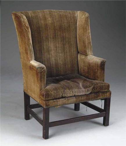 18TH CENTURY MAHOGANY WING CHAIR. The straight square legs have box stretcher, reupholstered in a striped green velvet material. Removable cushion. SIZE: 46” h x 32-1/2” at widest x 19” to top of cushion. CONDITION: Restoration to legs, otherwise good. 9-28027