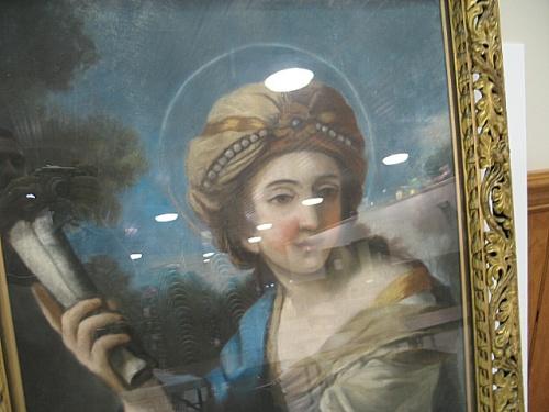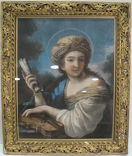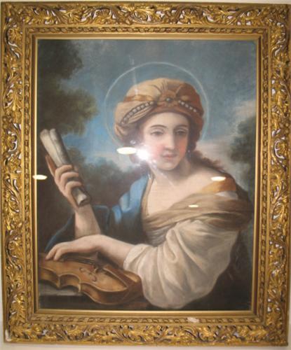 18TH CENTURY OIL ON CANVAS PAINTING OF ST. CECILIA. Beautiful painting of the patron saint of music in an ornate leaf gilt wood frame. In the manner of Giovanni Francesco Romanelli (1610-1662). Frame shows some loss to gilt at areas. 23.5" x 29" unframed. 31" x 37" framed. Unsigned.