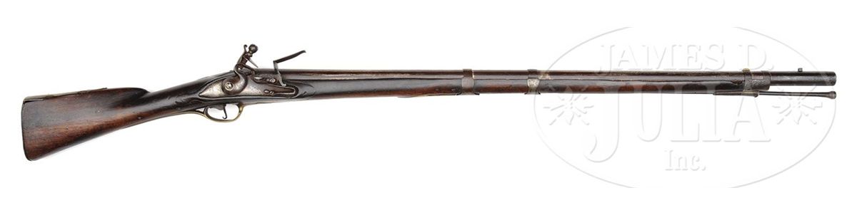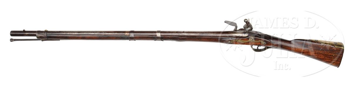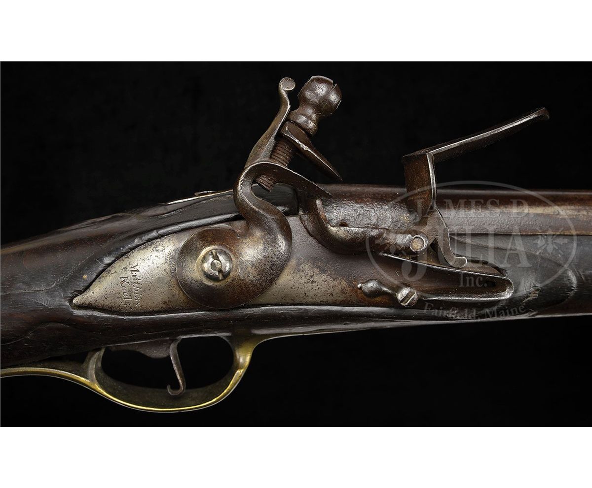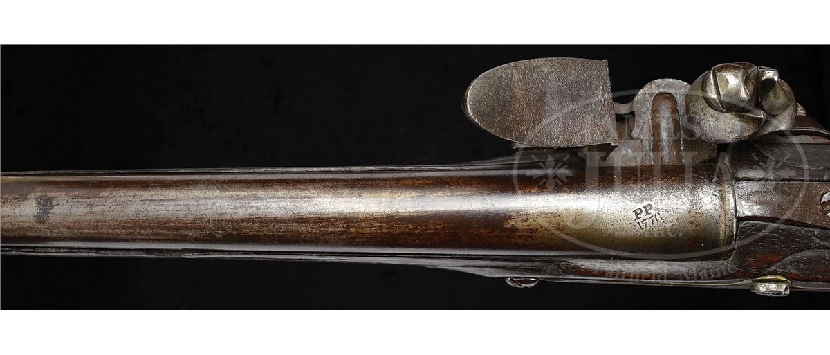 NSN. .80 Cal. x 36-1/8" bbl marked near breech "PP/76" appears to be of European manufacture. European lock is 6" long and marked behind cock "Matthias Keely" reading vertically in two lines. Bayonet lug set back 2" from muzzle. Furniture consists of an iron front band connected to a ramrod pipe, second and third bands also iron and friction held. Brass tail pipe, trigger guard, 4-screw buttplate and tailed side plate all salvaged from a Dutch musket. Stock measures 46" long having raised carved section around the lock, side plate and bbl tang as seen on early European muskets. PROVENANCE: Orig purchased from Kimball Arms or Worcester, MA by Charles Glenn (who began collecting in 1938 and died in 1995), after which the gun was purchased by Dr. Douglas Sirkin. CONDITION: Bbl and lock show aged patina except where "PP/76" and "Matthias Keely" marking are present, balance of iron showing medium pitting around touch hole and the associated lock components. Three iron bbl bands show light to medium pitting. Brass furniture is in very good condition with a pleasing yellow color. Wood is in very good condition showing a dark color from its age and oiling, having not been cleaned. 4-49820 PAS26
