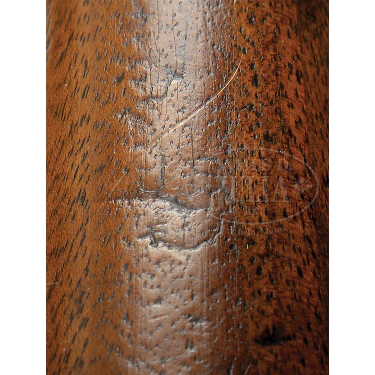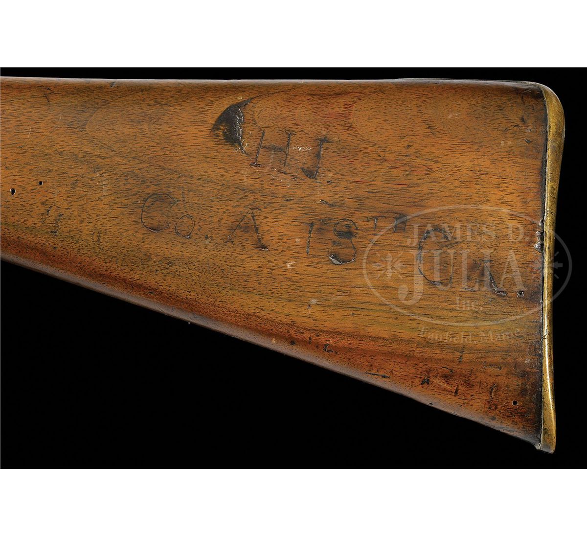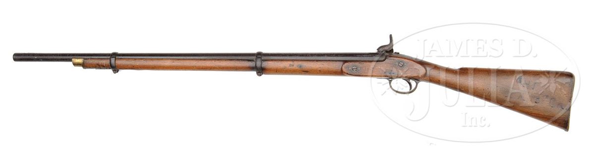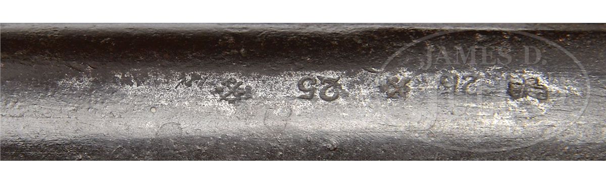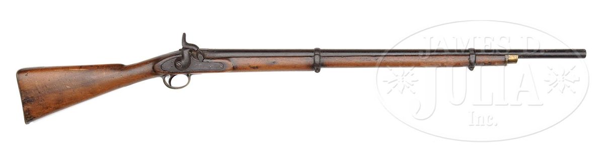 SN 1517. Cal. 577. This Model 1856 rifle has 33" bbl with correct Birmingham proofs, SN 1517 engraved on buttplate tang, "JS/anchor" stamped on bottom of buttplate comb and initials "HJ" of soldier in "Co.A 18th GA" carved in stock. Lock is marked and dated "Tower/1861". This is a rarely encountered Blockade Run Model 1856 rifle that is SN and ID to a particular unit and possibly a particular soldier with a little research. This gun is all orig and authentic as found. PROVENANCE: Dr. Andrew Kelley Collection. CONDITION: Gun is good overall "as found". Bbl, lock and bands are all dark and pitted, though lock markings and proofs are all discernible. Brass buttplate, trigger guard and nosecap have good yellow patina and SN engraved is easily seen. This gun was apparently utilized after the war as a smooth bore as front sight has been removed and bore is smooth, measuring over 60 cal with much pitting. Stock is sound and solid with a tacked repair between nosecap and front band. Stock maker's rnd cartouche appears to read "Bentley & Blaye Makers Birmingham". "JS/anchor" is discernible as is soldier's personalization (which is scraped & apparently someone attempted to remove), as seen in photos. 4-48860 JS23