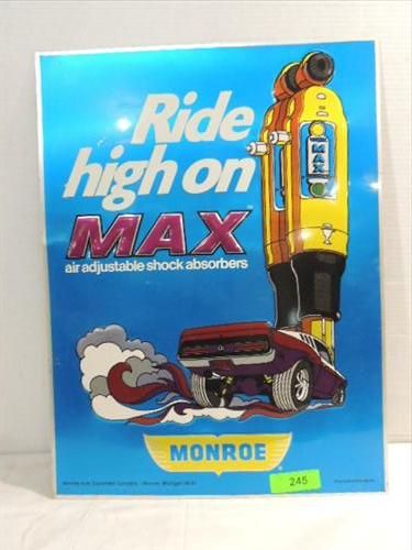 18X24 METAL SINGLE SIDED MONROE SHOCKS SIGN. MADE BY STOUT SIGN COMPANY. AS SHOWN. VIEW PICTURE FOR DETAIL.